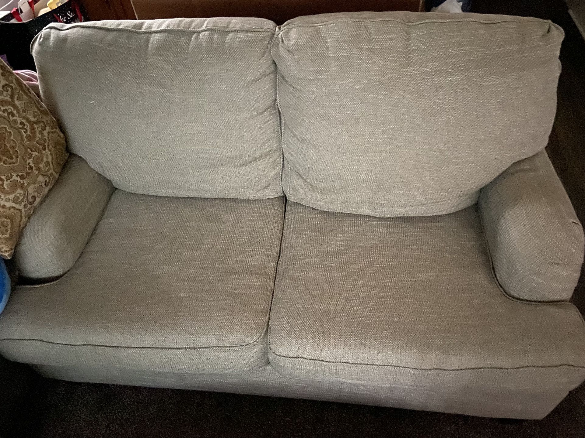 Beige color comfy loveseat *Pet free & smoke free home* Decent condition. Sags in the middle, wouldn’t be getting rid of it, but planning on moving and won’t have room for it. Still comfy but we use pillows in the middle portion of the couch to help with the sagging Keywords: beige, tan, off white, couch, chair, seating, seat, living room