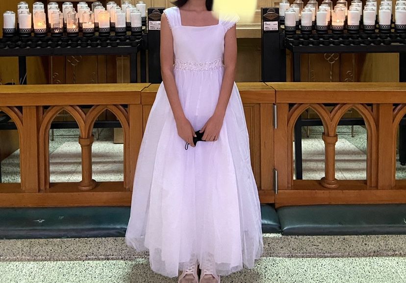 Girls lace gown. Used only once for first communion. Great dress for wedding or First communion. Purchased from JCPenney My daughter was 11 when she used this dress She was 5’2 ft tall in the picture