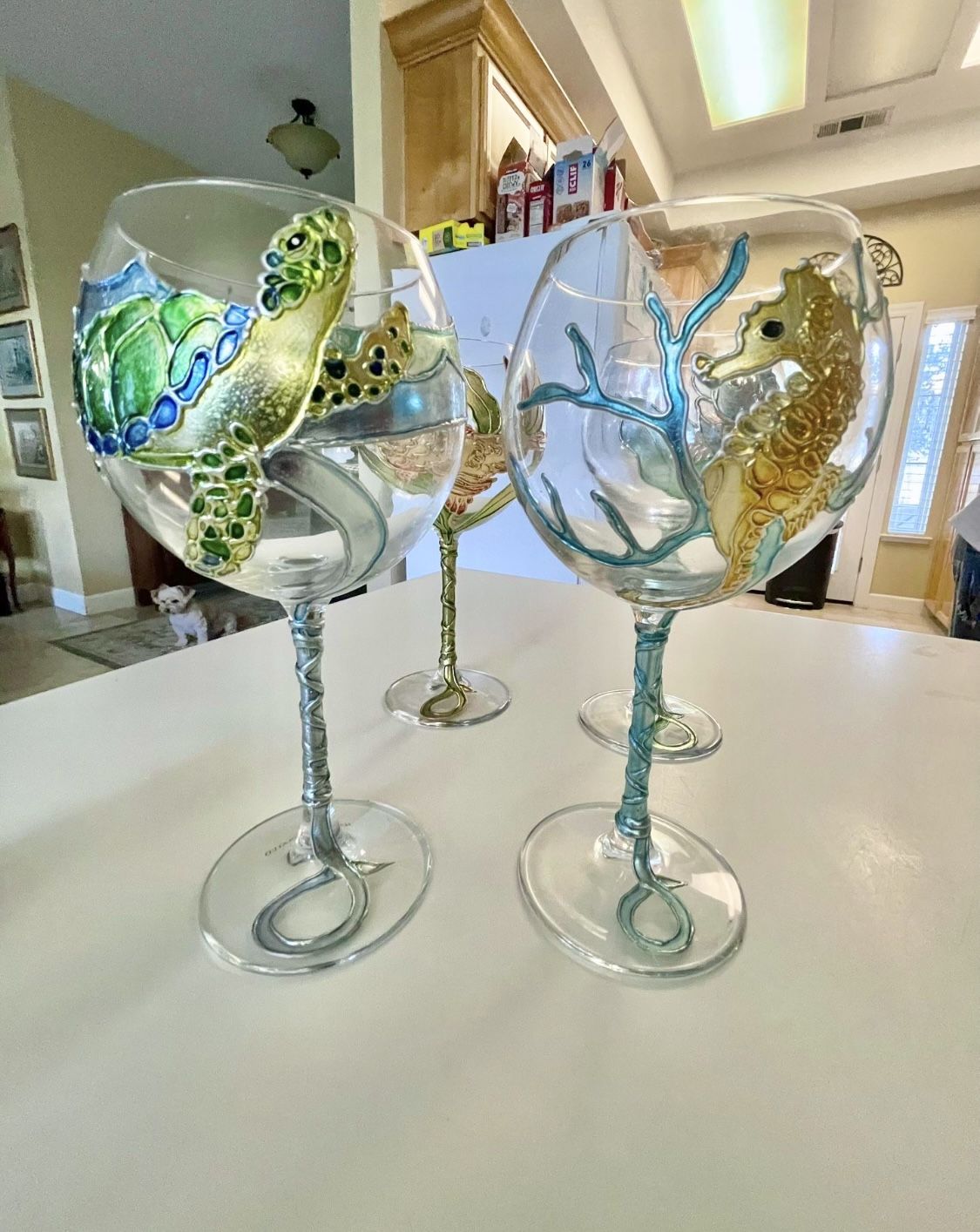 Four Uno Alla Volta Amedeo Hand Gilded Wine Glasses Painted In Verona Italy Seahorse, Turtle, Golden Fish, Blue Fish. Stunning!!Price Is FIRM