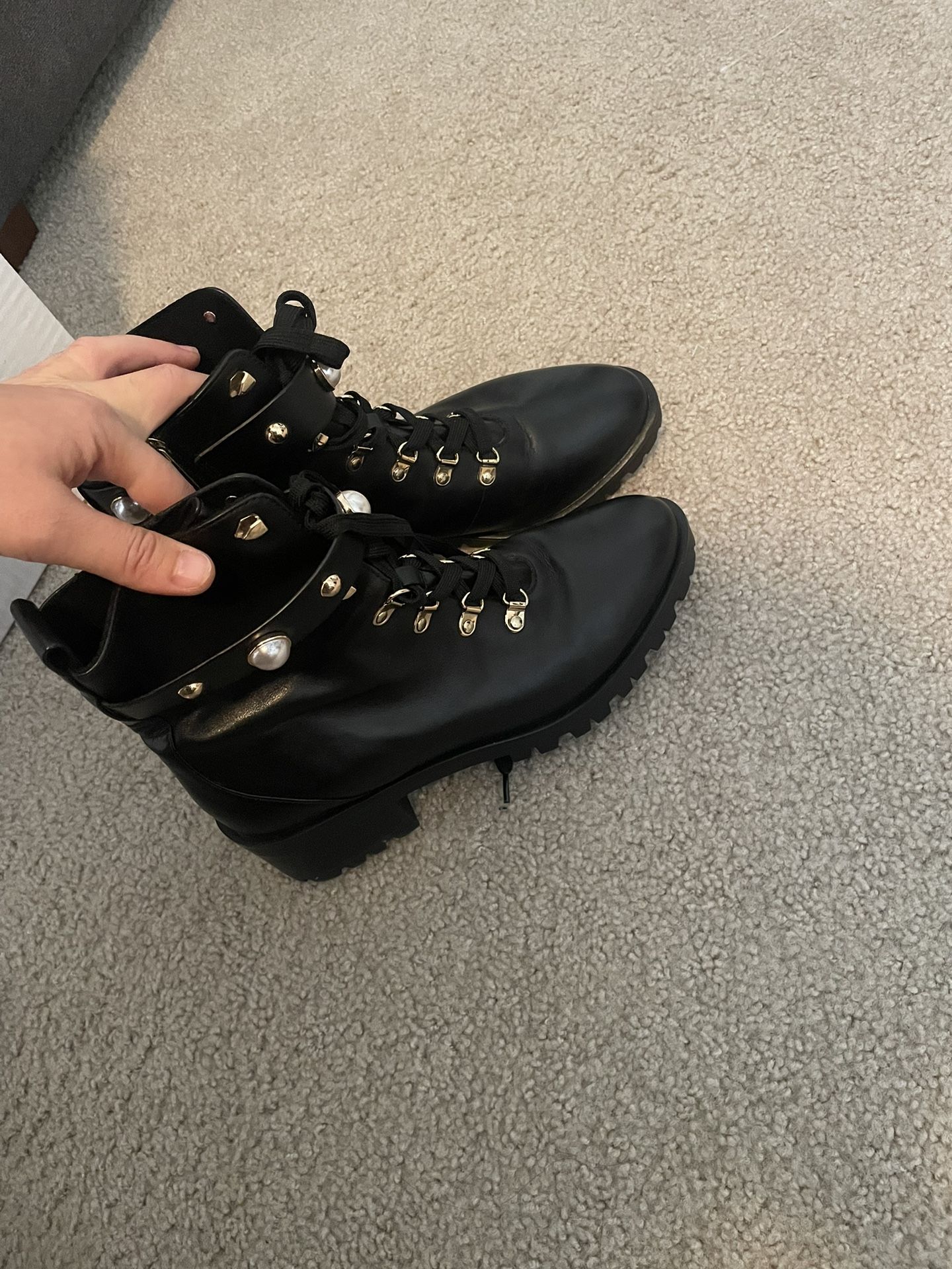 Karl laggerfield (Paris) size 9 black boots New never used out the box Mid boot above ankle length Upper synthetic leather Pearl design Short heel