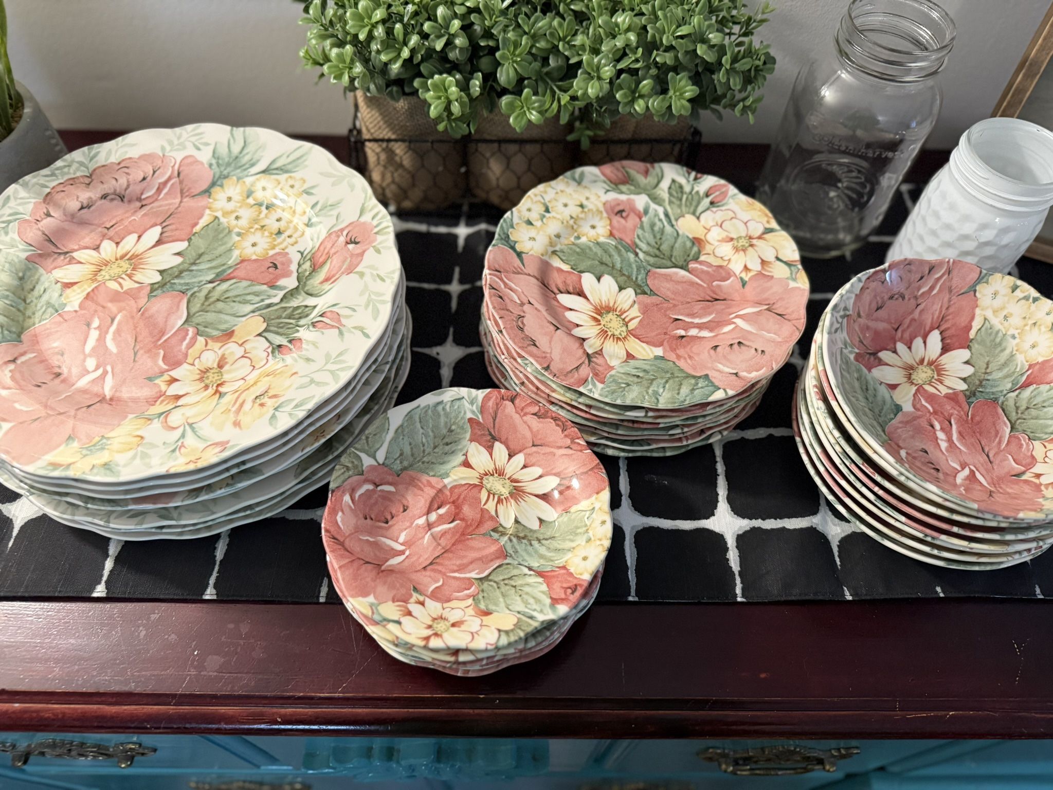 1993 Set of Nikko English Garden fine tableware plates {large & small}, saucers, and bowls