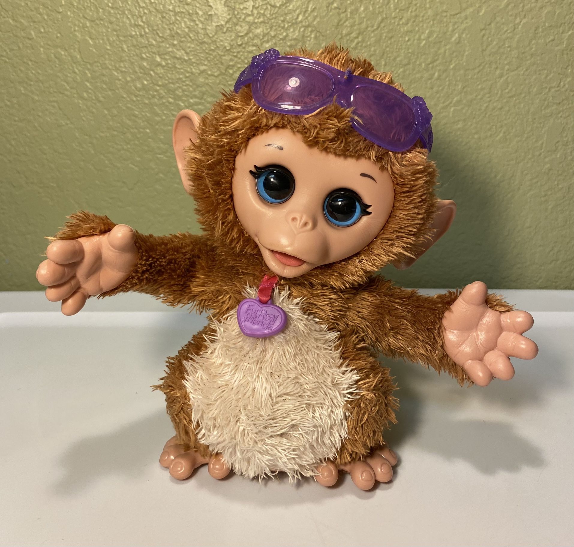 Hasbro, My Giggly Monkey Baby Cuddles, Interactive Pet Monkey, approximately 8in tall, tested and working, requires 3 AA batteries (not included), no stains or tears to fabric, works as intended - rub belly and monkey giggles & moves around, on/off switch on battery pack, light scratches to eyes and sunglasses from prior use, please see pictures, smoke free home