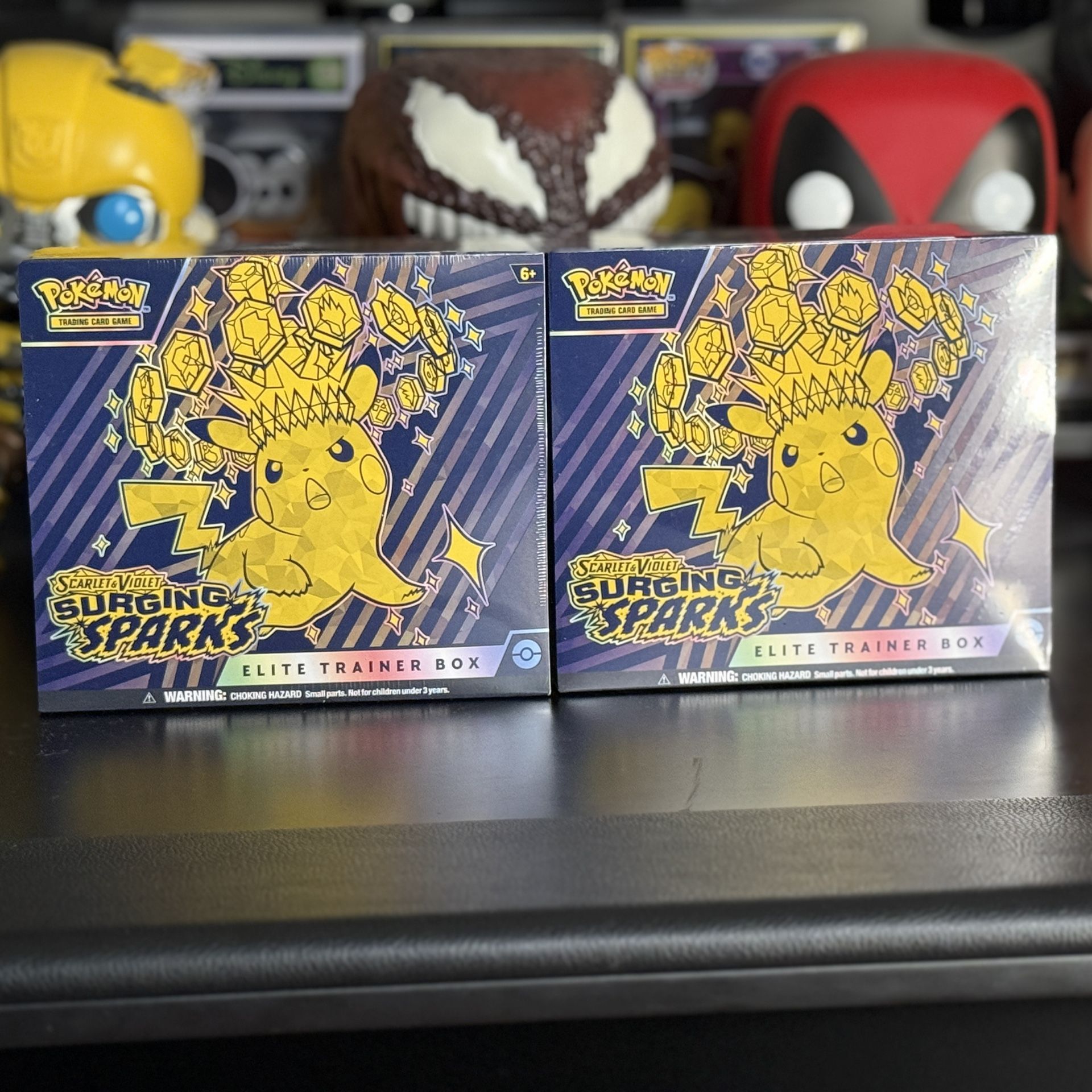Pokémon TCG: Surging Sparks Elite Trainer Boxes (2 Available) – $130 for Both or $70 Each (Brand New/Sealed) Selling 2 brand new, factory-sealed Surging Sparks Elite Trainer Boxes. Both ETBs are in excellent condition with no dents, tears, or corner damage. Perfect for collectors keeping sealed product, players, or anyone chasing hits from the Surging Sparks set. Each Elite Trainer Box Includes: • 9 sealed Pokémon TCG booster packs • Exclusive promo card • 65 themed card sleeves • Damage counters & dice • Player’s guide + rulebook • Collector storage box with dividers Pricing: • $130 for both ETBs • $70 each Condition: • Brand new • Factory sealed • Stored in a smoke-free environment Pickup in Spring Valley Message me if you’re interested!