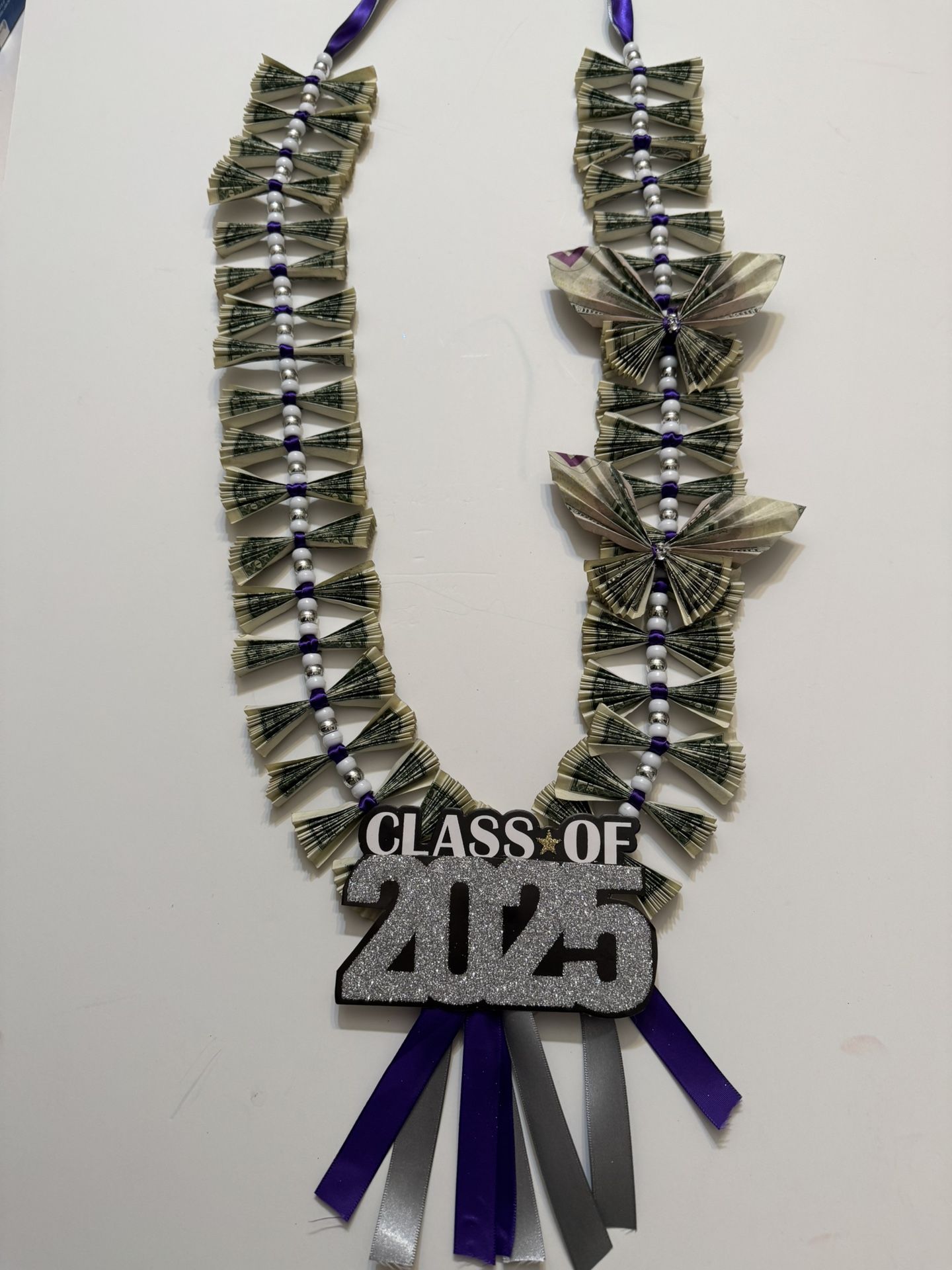 Purple and silver ribbon money Lei with white and silver beads Lei has 40 singles and 2 $5 bills on the butterflies I can make any color ribbon Pick up In west Hills 91304 Please order 2 days in advance