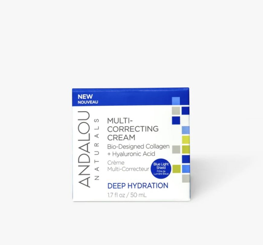 Andalou Naturals Deep Hydration Multi-Correcting Cream Skincare New Vegan collagen, hyaluronic acid and fruit stem cells help repair skin elasticity, boost hydration and protect vitality, while ectoin helps defend against blue light. Natural and delicate fragrance infused with a blend of sage, tea tree and jasmine oils, known for soothing and calming benefits, will indulge and refresh the senses. Size: 1.7 oz To Use: AM & PM. Apply to clean face and neck.