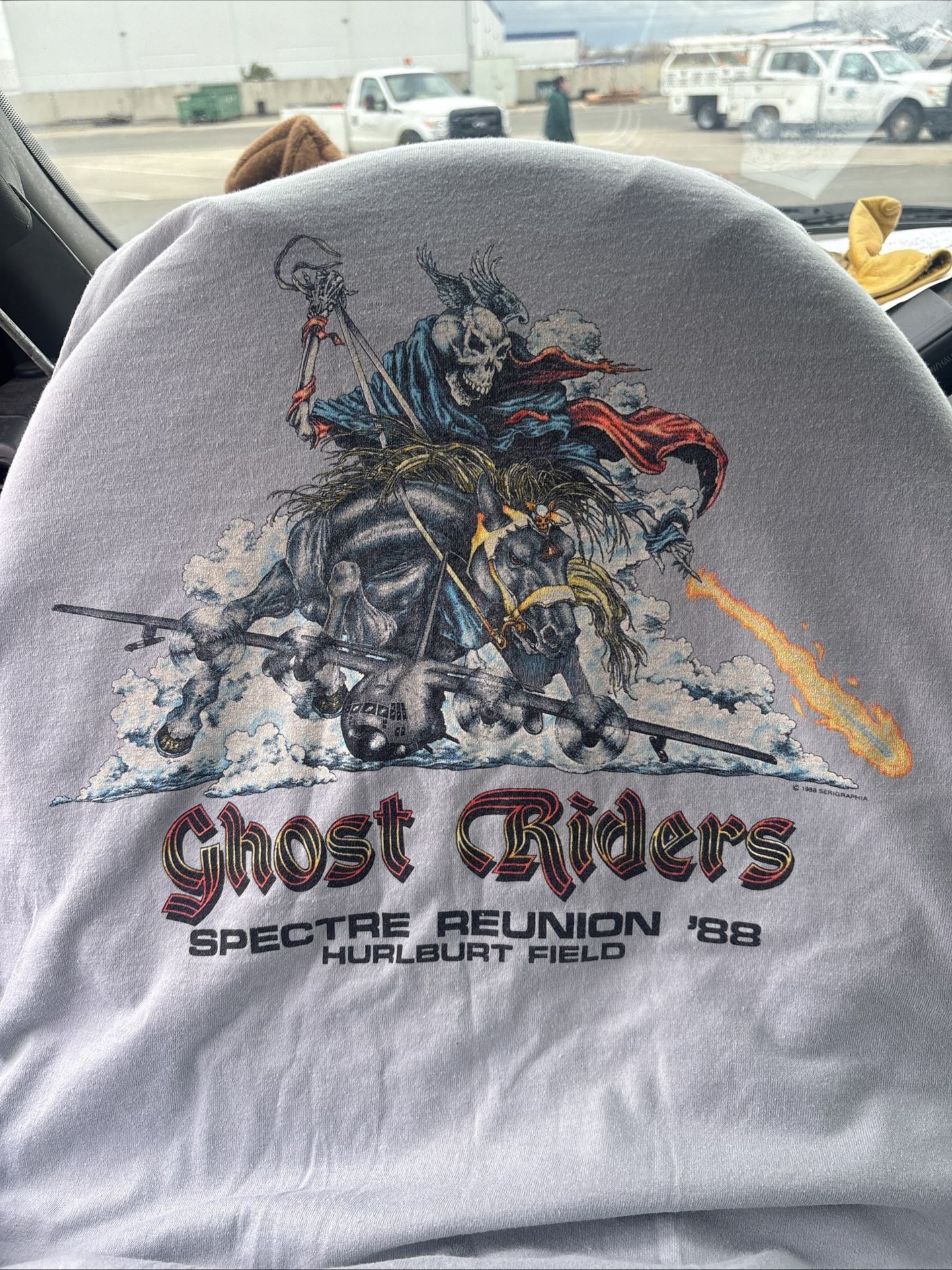 Extremely rare vintage find! This is an original commemorative shirt from the 1988 Spectre Reunion held at Hurlburt Field/Ft. Walton Beach, Florida. This shirt features the iconic "Ghost Riders" (16th Special Operations Squadron) artwork. The graphics are incredibly detailed, showing the Grim Reaper on horseback jumping over an AC-130 gunship with a massive fire trail. I can send more photos. Great shape.. Size XL