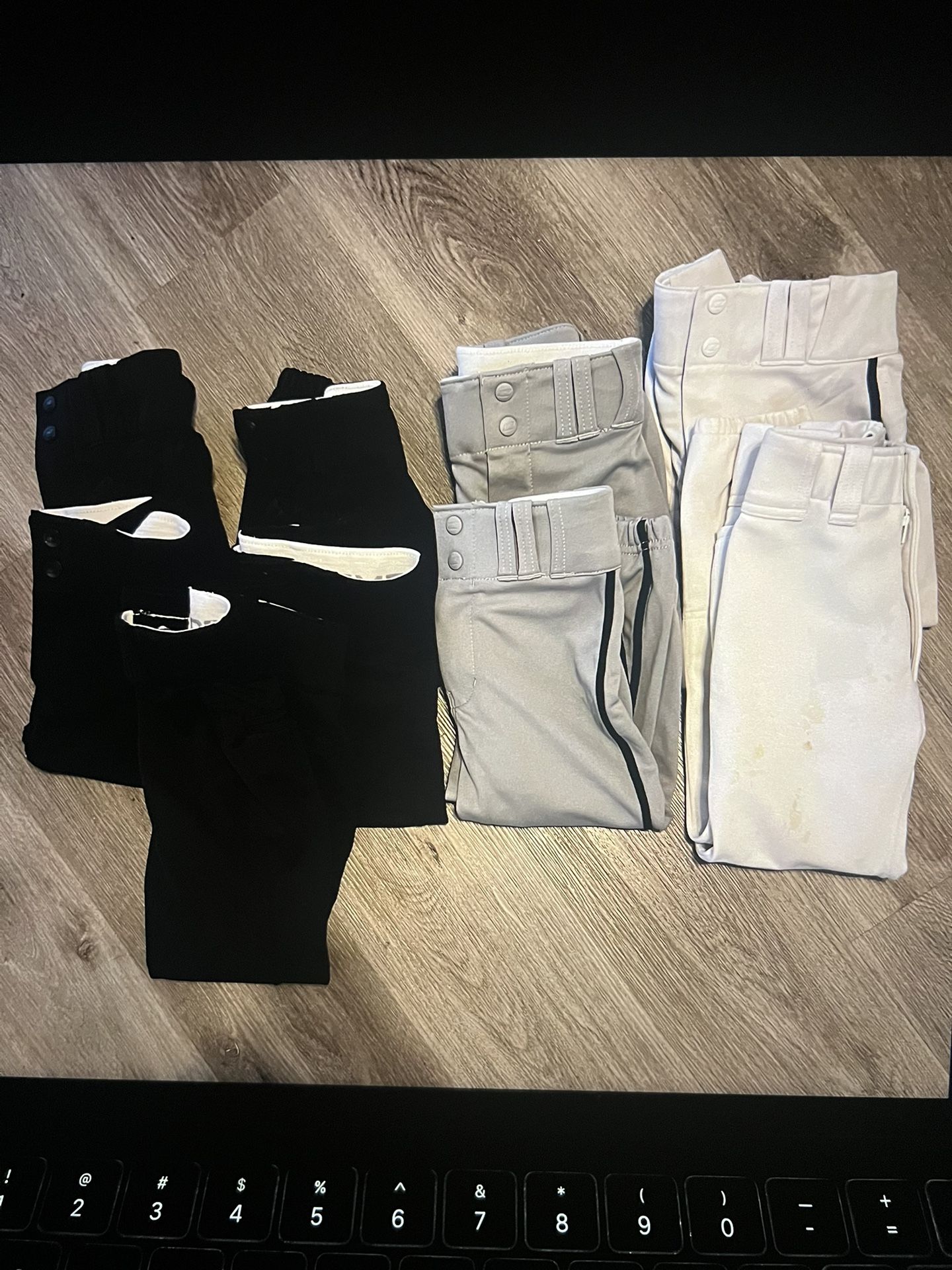Size small- some are brand new never worn. Short and long pants. Baseball belts as well $5/pair