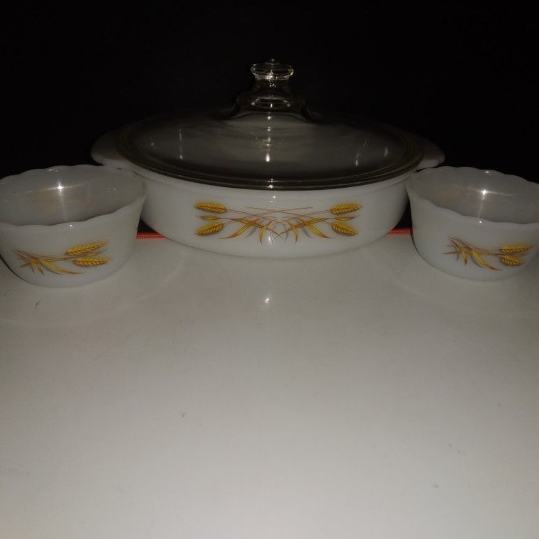Vintage pattern on milk glass casserole dish with original lid in excellent condition with 2 custard cups. #558