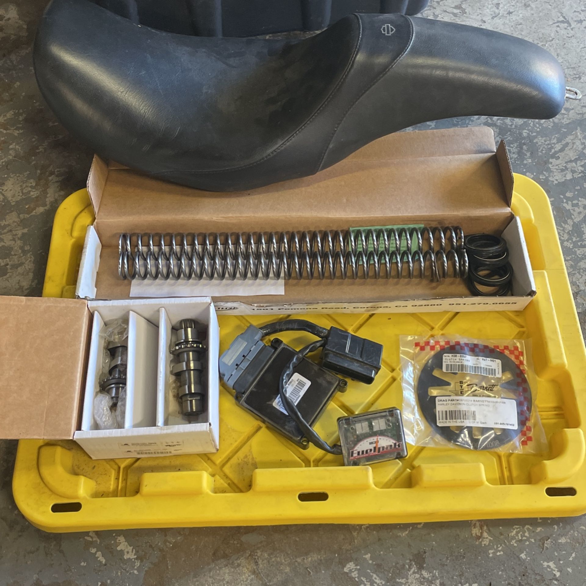 Make an offer Random parts from an 06 Dyna V&H fuel pack, barnett HD heavy spring plate HD sundownder seat good condition no tears. Stock front springs cams and ECM.