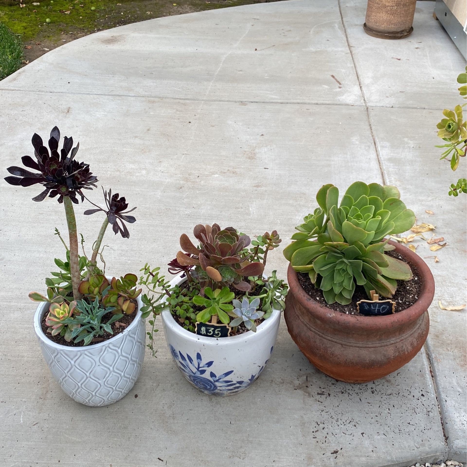 White pots are 10 inch variety of beautiful plants $35 each Terra cota 12in large heavy pot $40