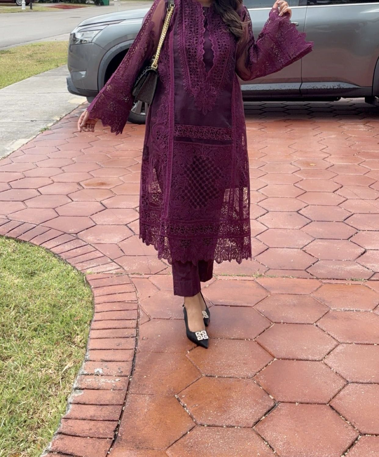 Celebrate traditional elegance with this beautiful two-piece Pakistani style dress. Made from high-quality organza fabric, it includes a stylish shirt and matching trousers (no dupatta). The dress features delicate all-over lace detailing in matching purple, adding a touch of sophistication and charm. Worn only once, it's practically new and perfect for festive occasions, family gatherings, or formal events. Combines comfort with timeless style.