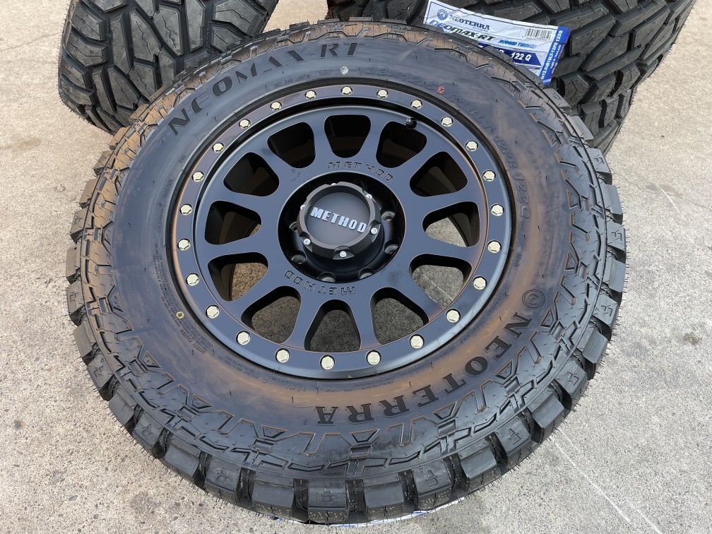 Brand new set of 18" METHOD MR305 NV Matte Black wheels with Heavy Duty Mud tires. BRAND NEW! They come mounted, balanced and ready to go! Wheels come mounted and balanced! Installation available! !!Available with other tire brands and sizes!! Setup Fits: •1994 to 2026 Dodge Ram 2500 and 3500 •1999 to 2010 Chevy Silverado 2500 and 3500 •1999 to 2010 GMC Sierra 2500 and 3500 •Hummer H2 Wheel size is 18x9 offset is 18, and the bolt pattern is 8x6.5 $1,950+tax with 33x12.50R18 mud tires. $2,200+tax with 35x12.50R18 mud tires. Cash/Debit or Credit Card+3% accepted! Financing available.