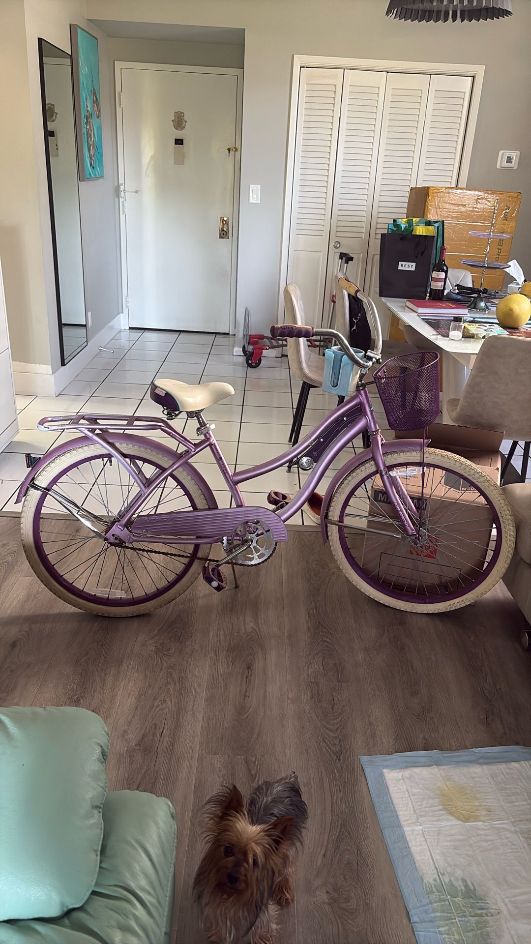 Purple bike. Wheels slightly squeak — just needs lubrication and will be fine. Wheels and bike need a wash. Has a few small dents, nothing serious, does not affect riding. Overall a good bike, everything works.
