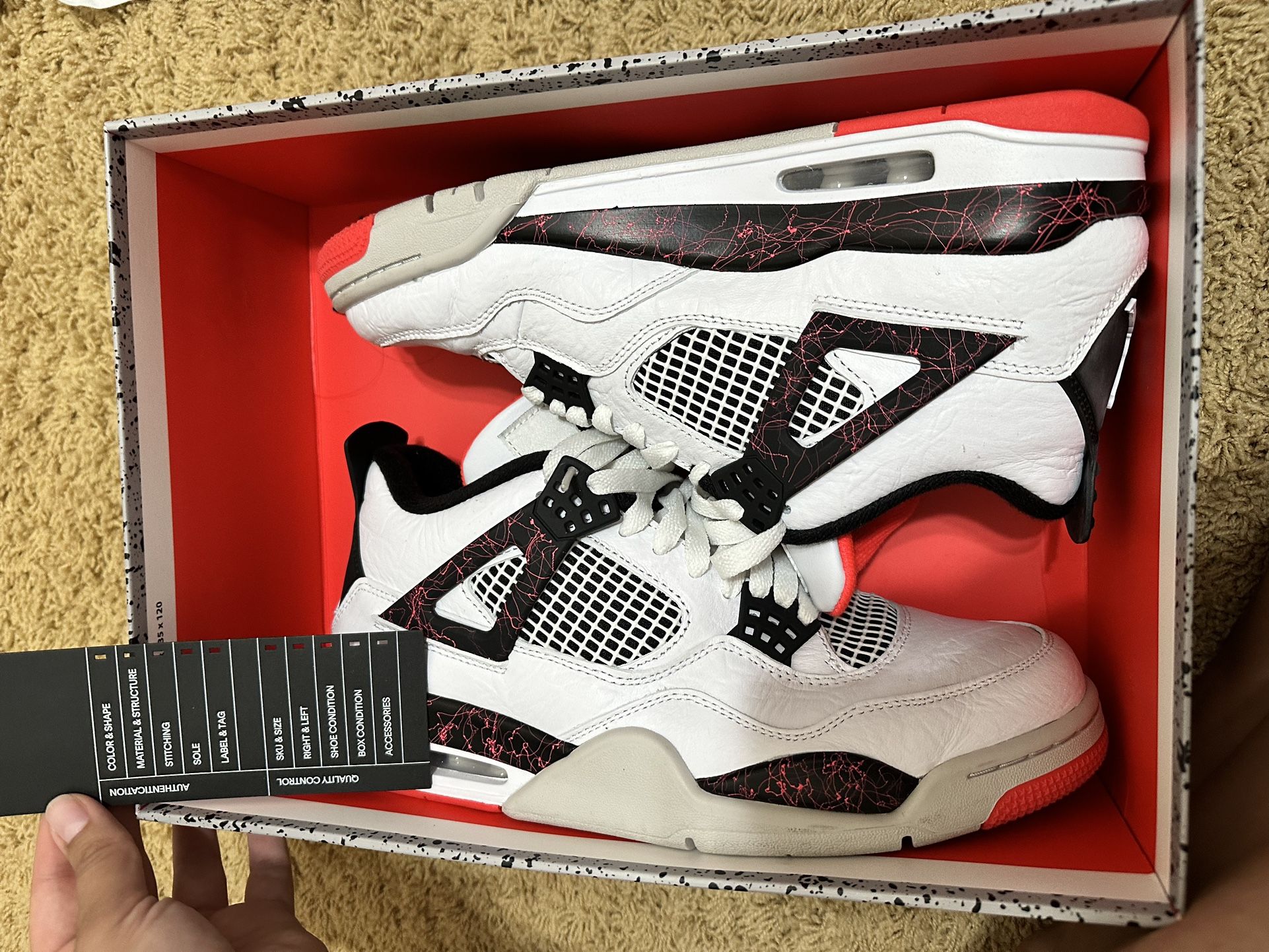 Air Jordan 4 Retro. WHITE/BLACK-BRIGHT CRIMSON. 8.5 Men’s/ 10 Women’s. Goat Certified. Used, barely worn. 3-5x, bottoms worn. No try ons, comes in box.