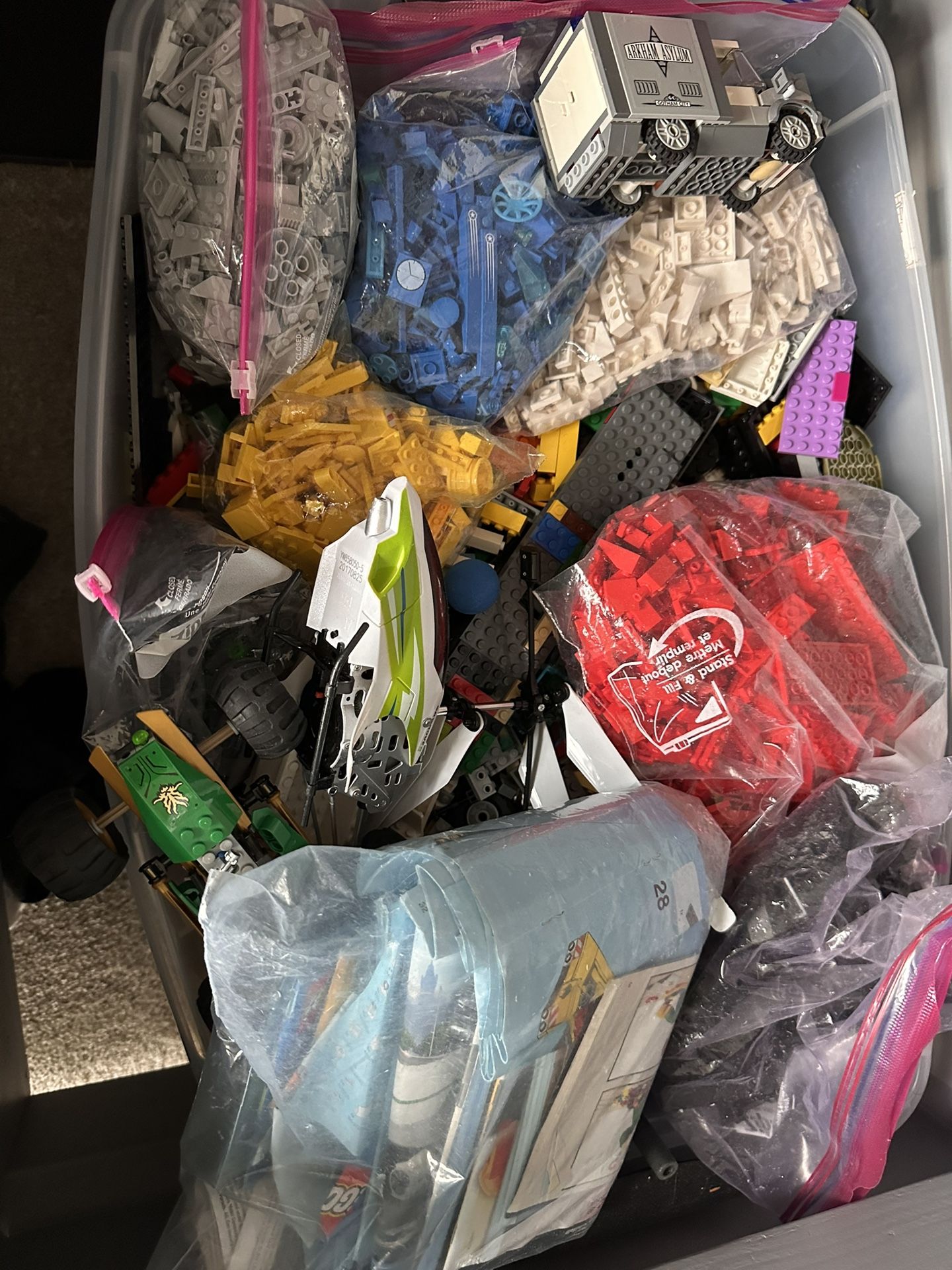 Have collected a lot over the years Many sets that are already built and ready to play with Big tub of legos that haven’t been used in a while
