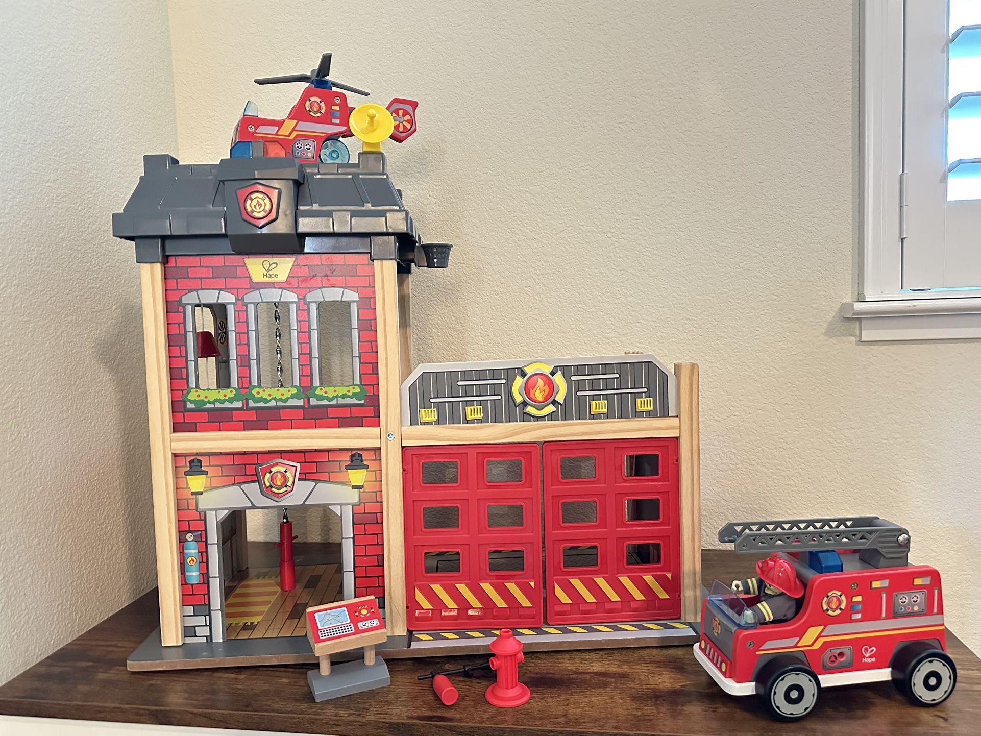 Hape city fire station/ kid pretend toy firefighters fire station, fire truck/ fire helicopter/fire Truck Party Decoration