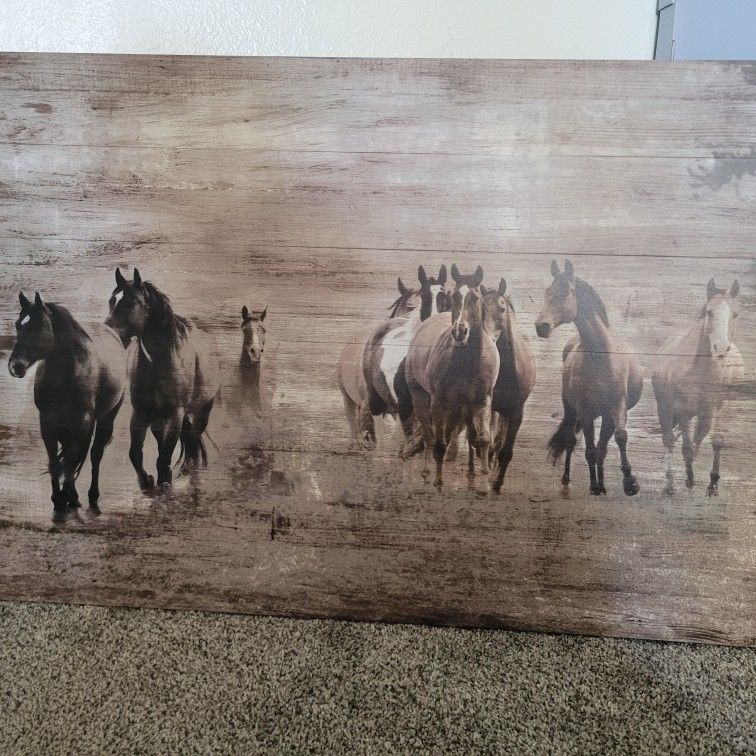 Bring the spirit of the wild into your home with this beautiful rustic wall art featuring a herd of horses in motion. Set against a weathered wood background, this piece adds a warm, Western touch to any space. Perfect for horse lovers or anyone looking to add some rustic charm to their home.