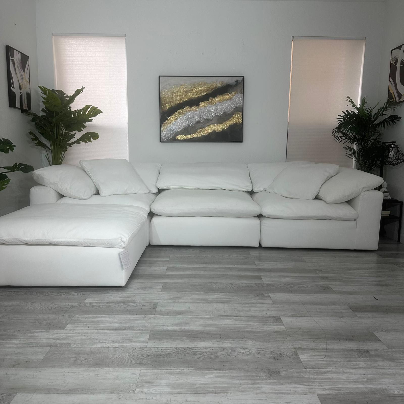 • ABOUT SECTIONAL • • SHIPPING: Free Delivery • CONDITION: Very Good • BRAND: City Furniture • MATERIAL: White Fabric • FIRMNESS: Soft Foam (Feather) • BASE: Legs Plastic • DIMENSIONS: - Modular 135”L 45”W 30”H - L-Shaped 90”L 45”W 30”H - Ottoman 45”L 45”W 18”H • INCLUDES: - 5 Back Cushions - 2 Corner Chair - 1 Armless Chair - 1 Ottoman