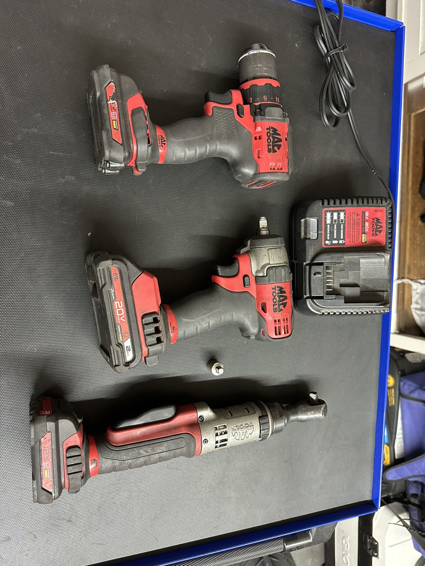 Mac brand mechanics power tools with 3 batteries and a charger , full kit 3/8 impact, drill, 3/8 electric ratchet. Everything works perfectly.