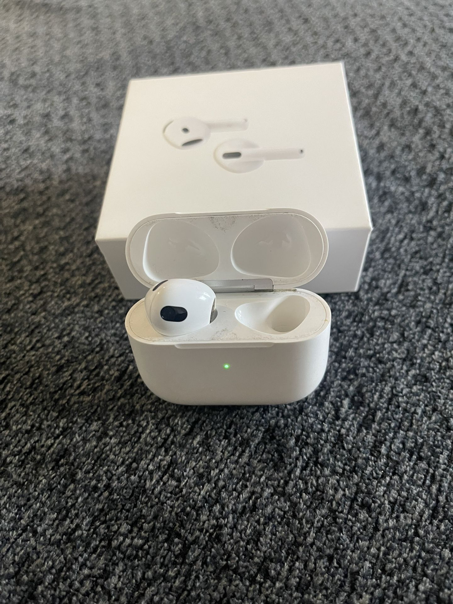 I got these Apple AirPod 3 headphones for sale. All in good working condition only missing right ear bud. Charges on regular wire (not included,but will be 100% charged) ready to pair. Asking $70 for it or best offer located in El Monte. I am original owner bought them at target last year, comes with original box. Apple AirPod AirPods Pro noise cancellation Right left earbud ear buds