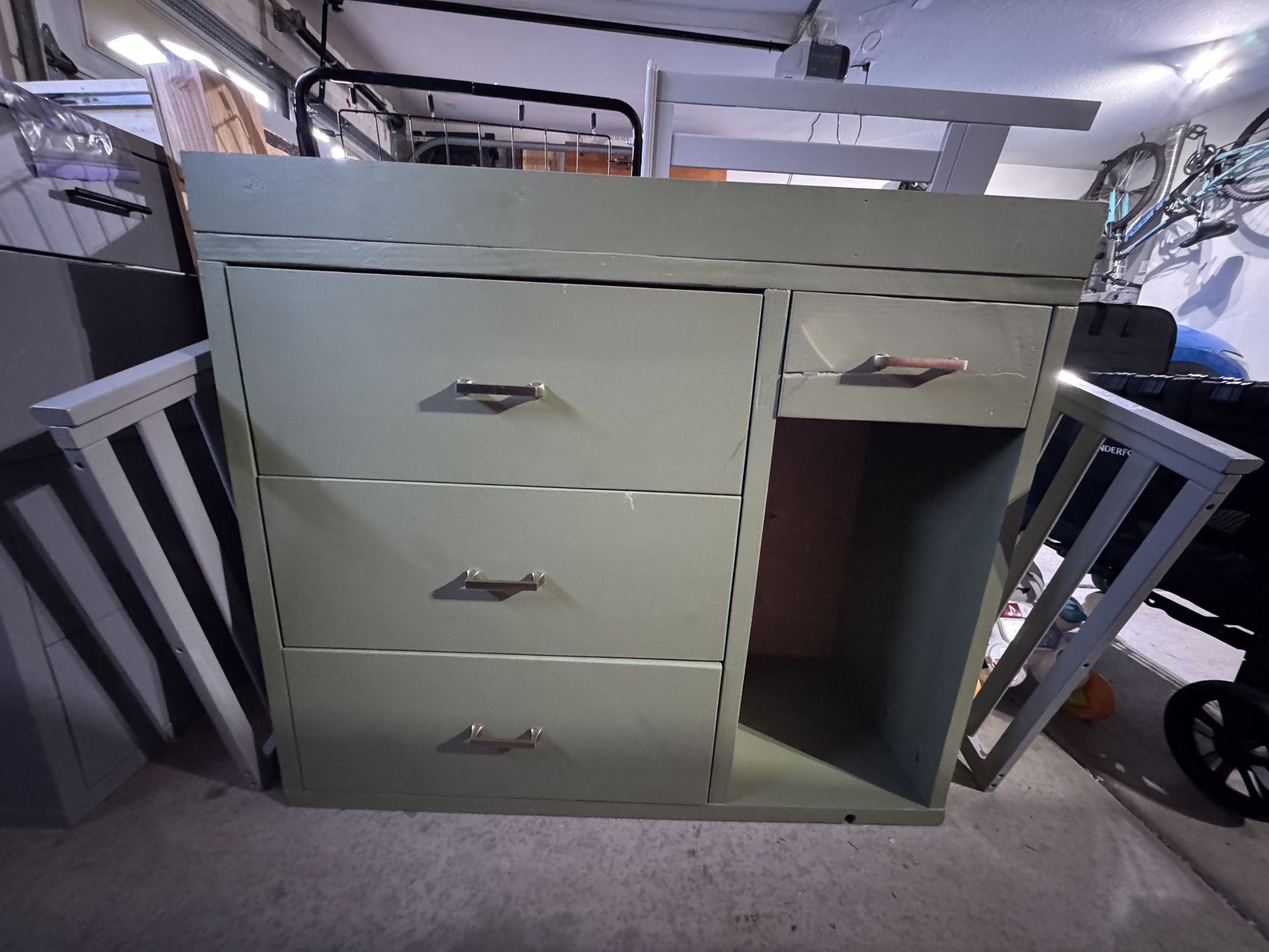 Baby changing table/dresser combo. Home made. 45 inches wide x39 inches tall x 18 inches deep. Fits a standard baby changing pad and has room for wipes and extra diapers on top.