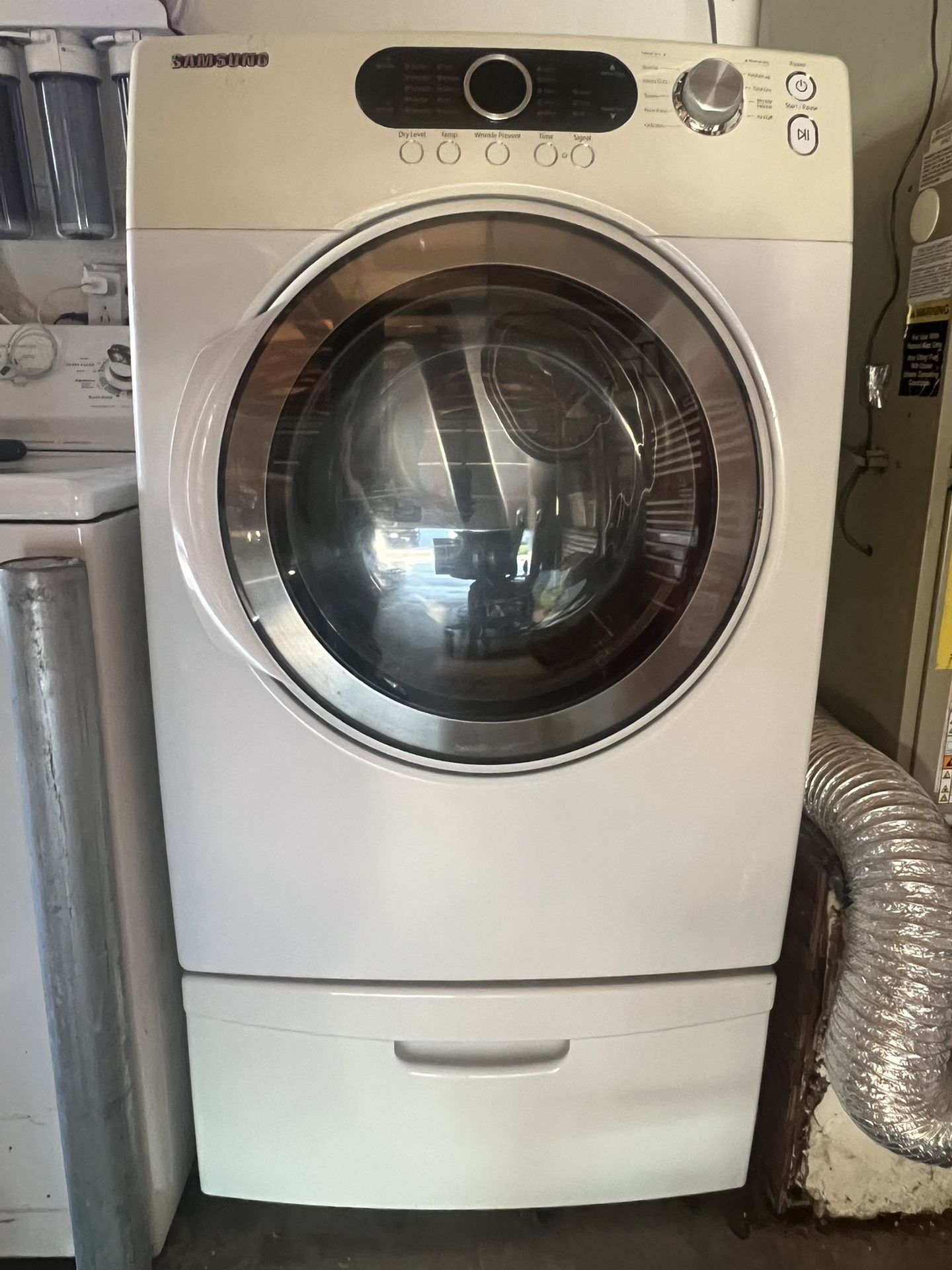 Samsung gas dryer with storage stand. Has sensor drying and custom settings. Works good, large capacity. The storage stand on the bottom makes things nice.