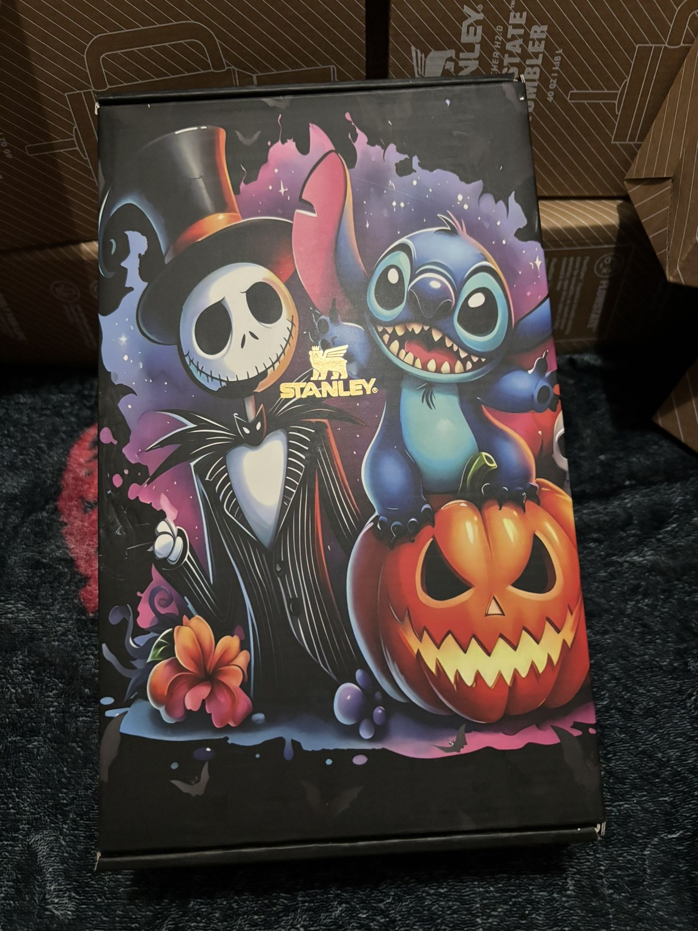 Stanley Quencher H2.0 FlowState Tumbler featuring a Halloween-themed design with Jack Skellington and stitch. brand new 40 oz. 11 hours cold 2 Days iced 7 hours hot. Nuevo stanley jack y stitch mantiene la bebidas frío por 11 horas 2 dias hielo,7 horas caliente