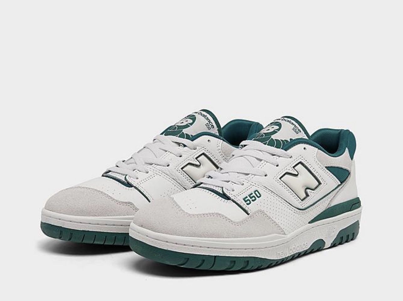 The New Balance 550 White Green features a smooth white leather upper with a grey suede toe wrap and green