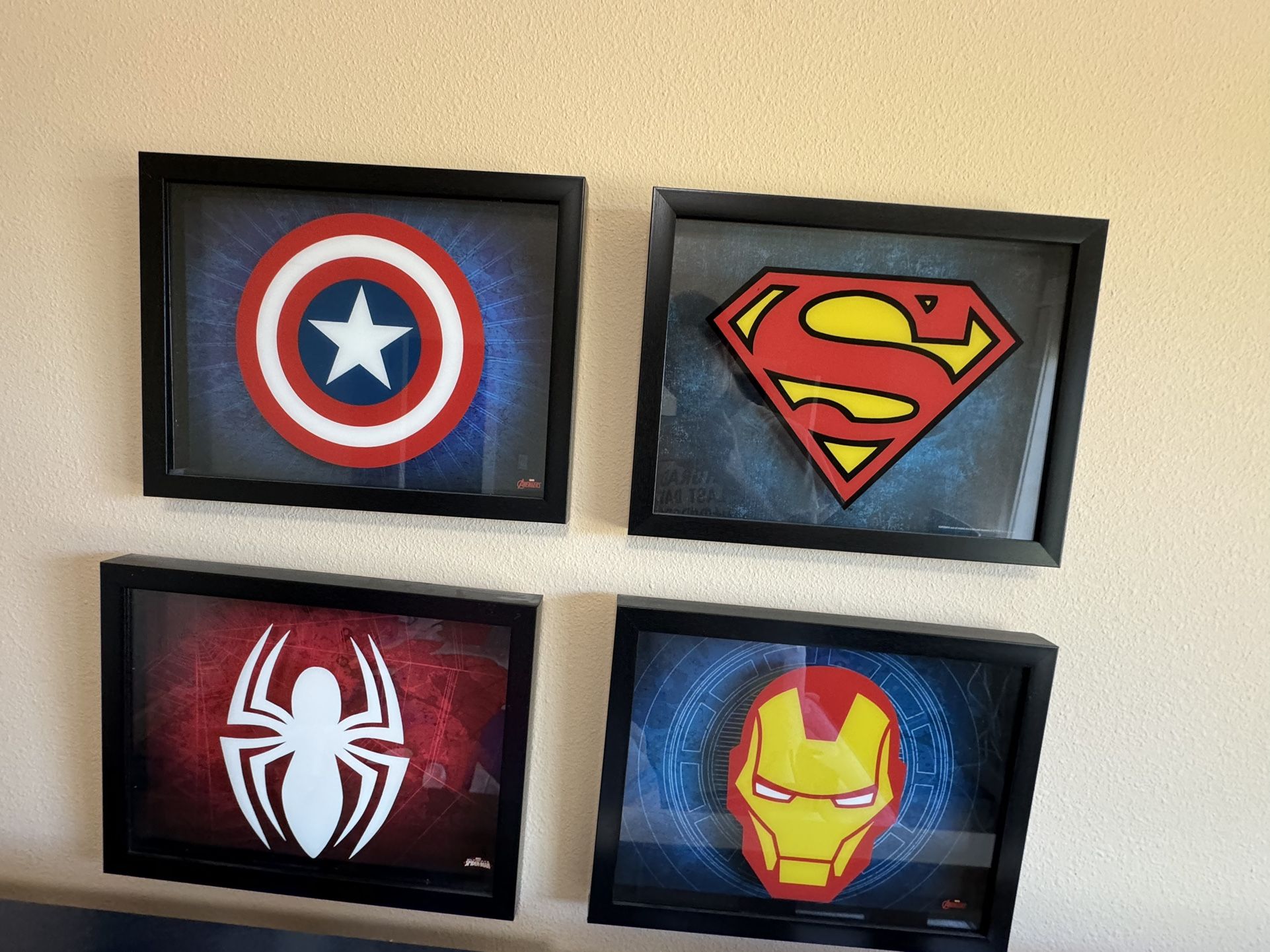 Avengers superhero spider man, iron man, super man, and captain America glass frame in new condition. Just out of packaging. With a great background showing the main symbol of each avenger. Separately 30 dollars and all together 100 dollars. If buy two 55 dollars and if buy 3 80 dollars. Licensed product from DC and marvel.