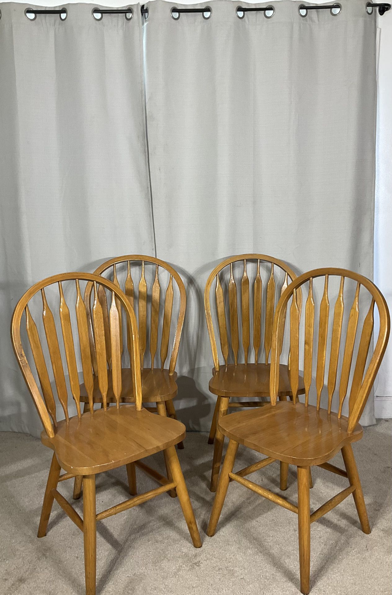 TEXT ONLY * PICK UP ONLY Experience the perfect combination of country and modern with this set of Windsor side dining chairs in light oak finish. Featuring tall arrow backs and wide contoured seats. Solid, sturdy construction. Great condition. Sold together only.