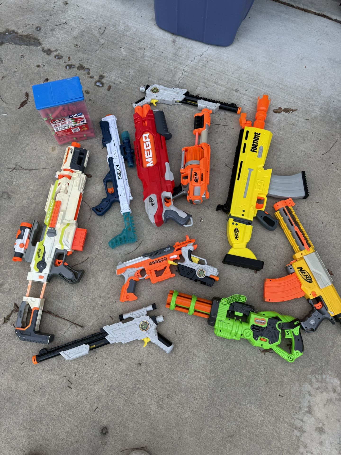 Assorted lot of Nerf and Nerf adjacent guns. Box of darts included (Holds 200 darts but unsure exactly are inside) all guns are used and do work properly. Batteries not included. Selling as a lot but if just a single gun is wanted we can discuss