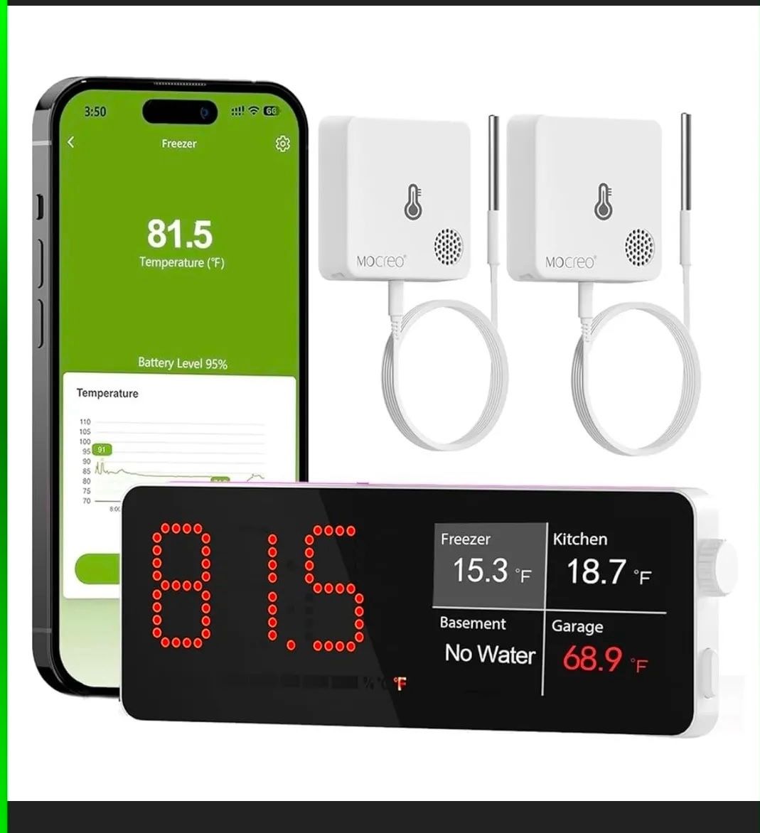 WiFi Thermometer Freezer Alarm, Email Alert, App Notification, Data Record Export, 2 Remote Wireless Temperature Sensors for Refrigerator, Freezer, Hot Tub