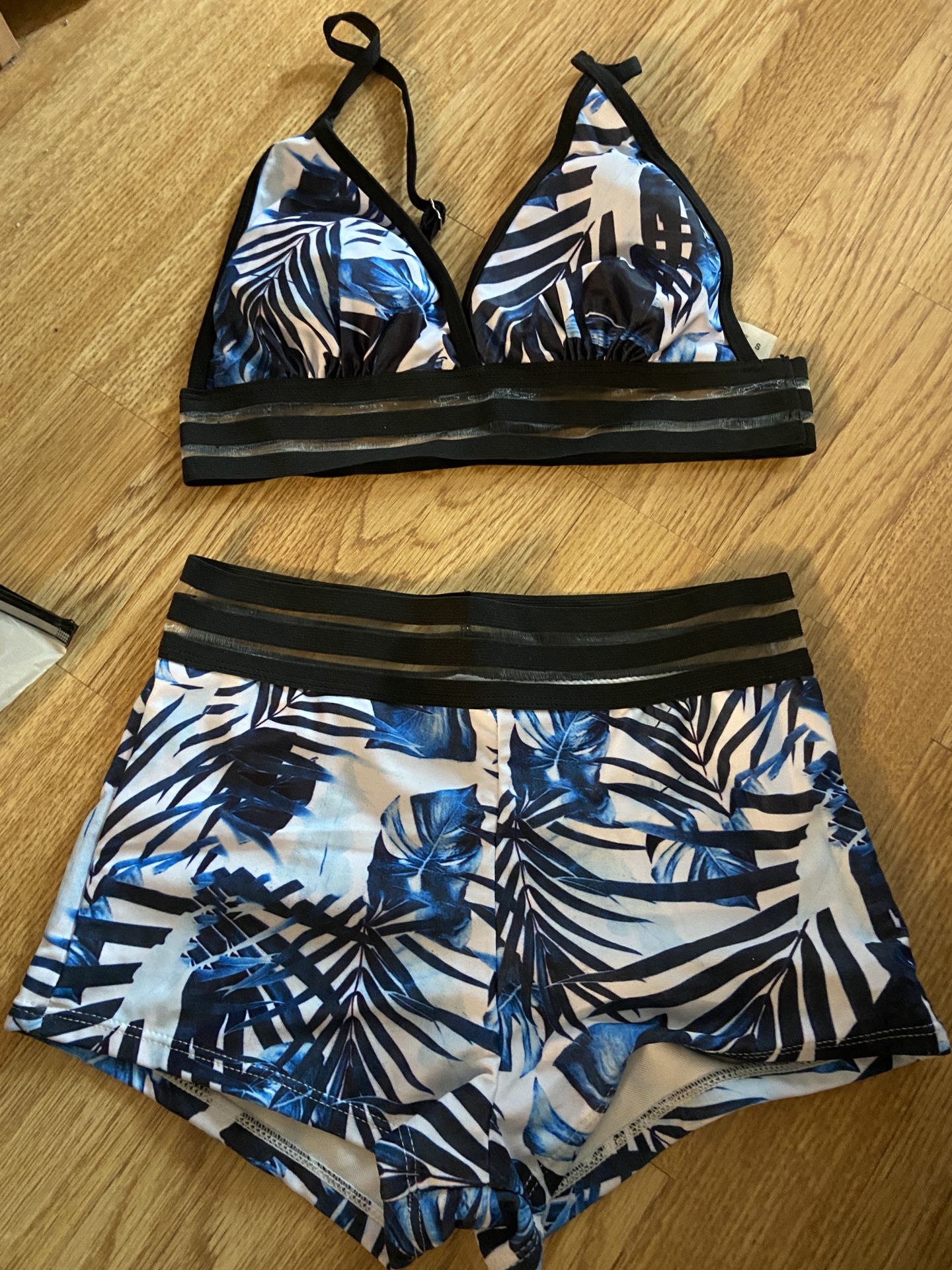 Blue/whit flower $10 small Yellow top $2 Animal print $4 each top med bottom large Black and gold $10 small top like xs Blue and black $6 like xs One piece $8 like XS
