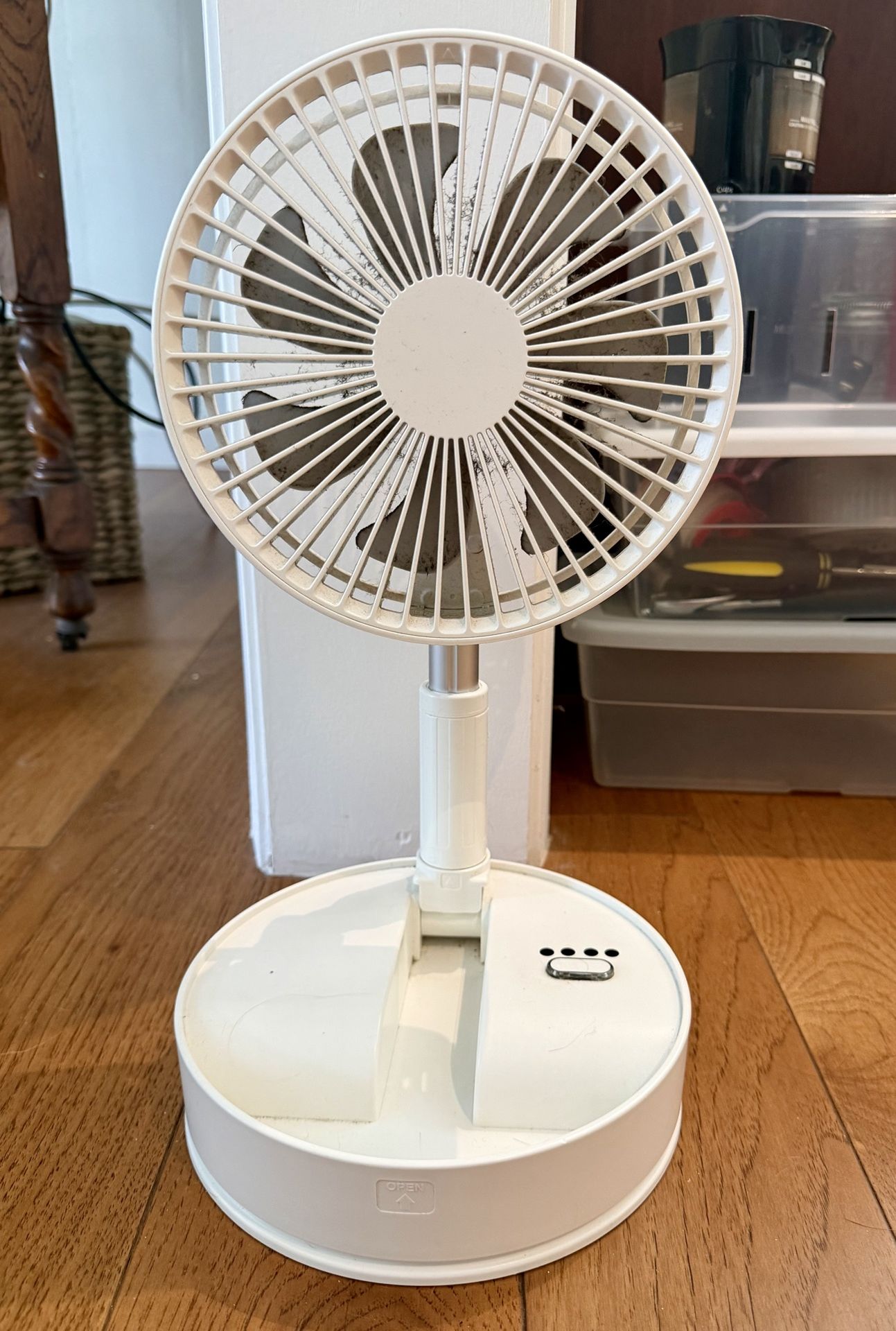 2-in-1 adjustable fan – expands to standing fan or desk fan (portable) Chargeable Includes charger & remote Multi-speed Oscillating Works perfectly Fan blades could use cleaning