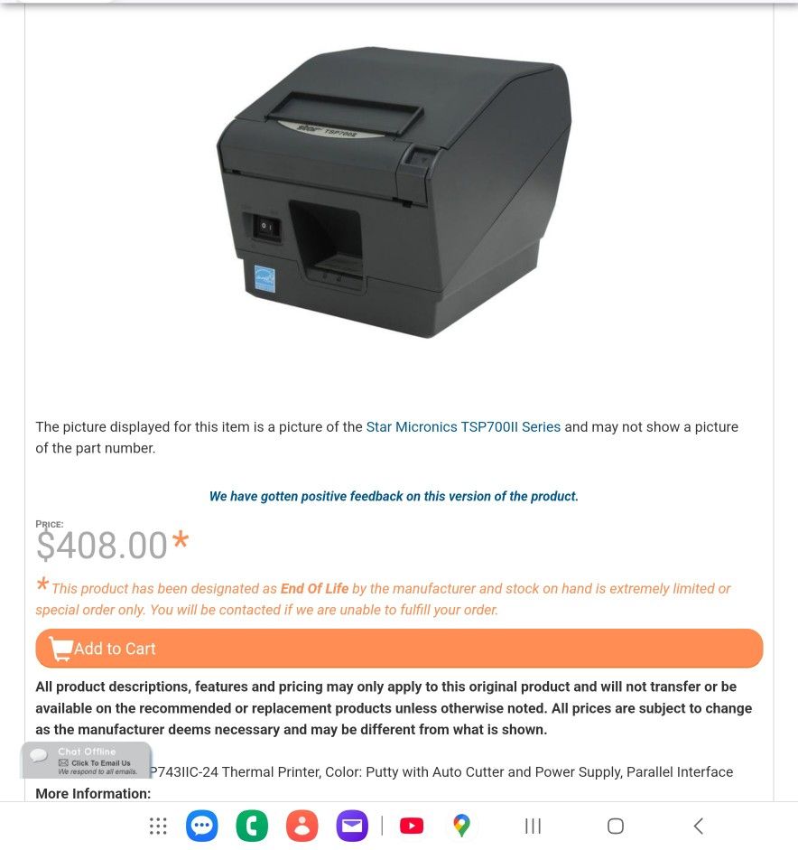 Selling my star tsp 700ii pos printer. In perfect running condition with ethernet connection for networking. $175. I have 5 available