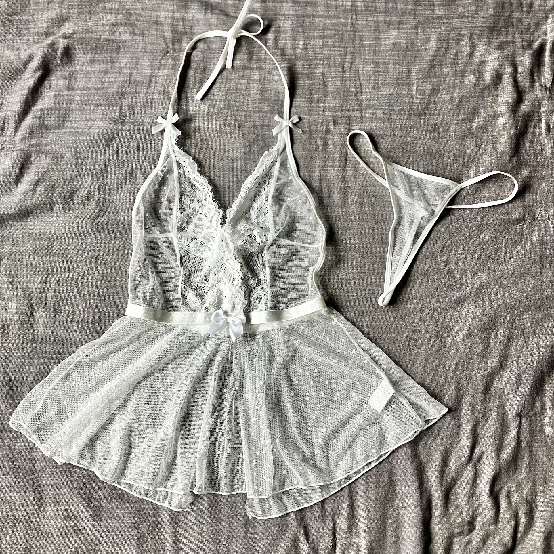 Size medium. NWOT, never used. Size medium. Stretchy all white lace that opens in back. Waistband is elastic. Thong included.