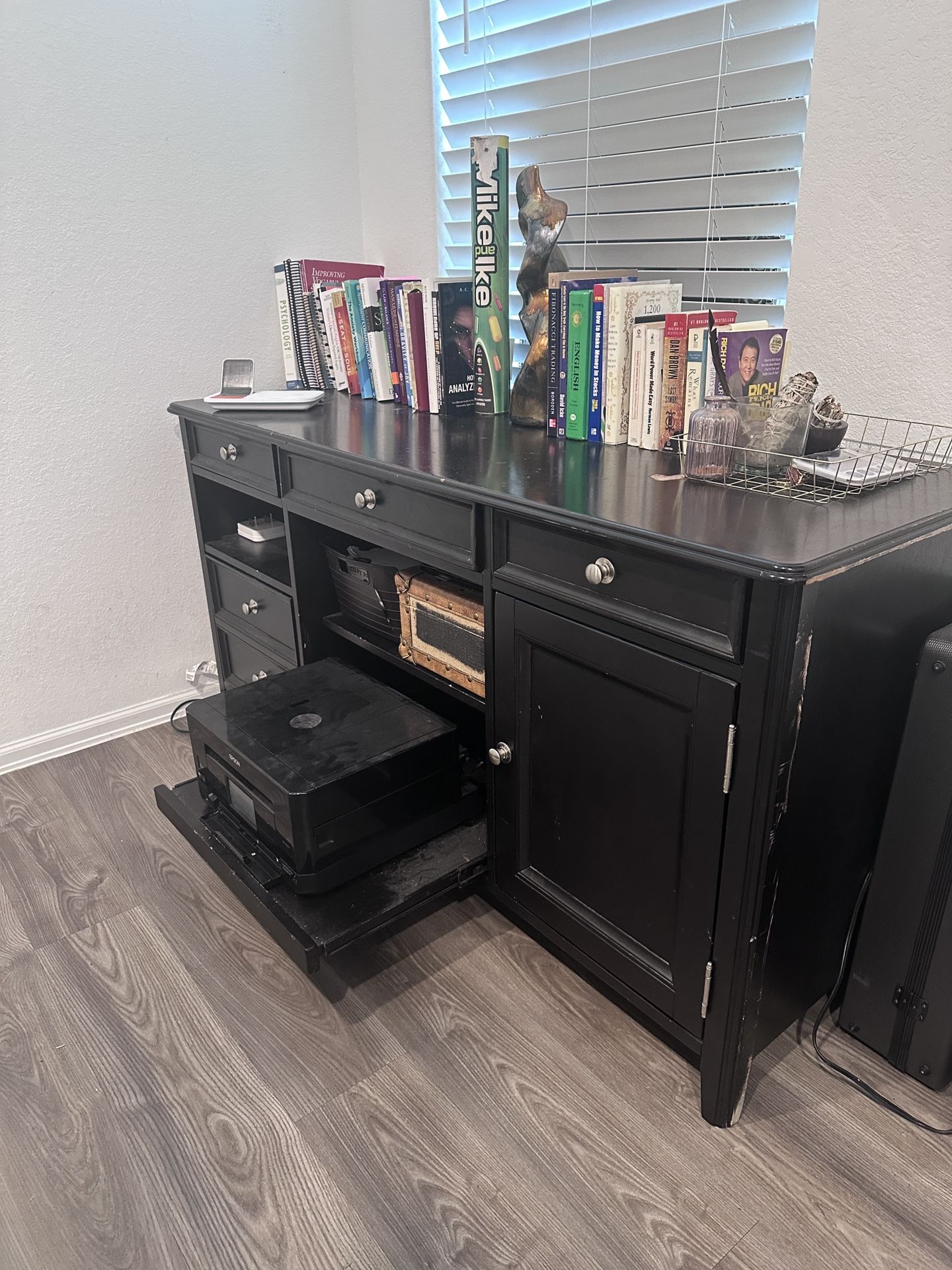 This stand has a filing cabinet and a printer sliding slot. Three drawers and one storage cabinet. Very heavy some wear but pretty sturdy and is in great condition. Can be used in an office or bedroom