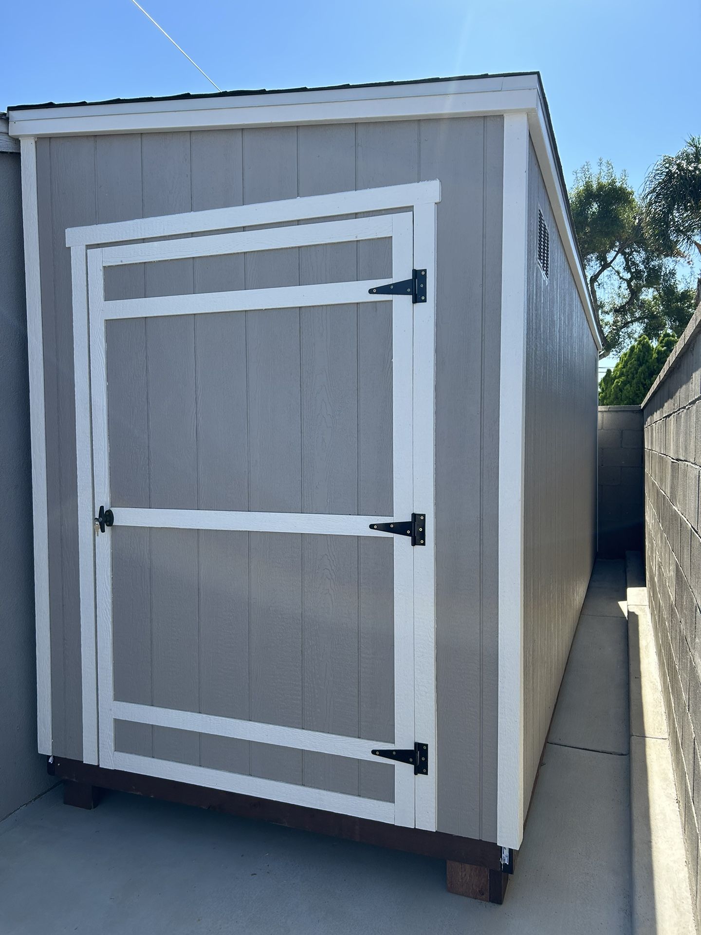 Shed 6x20x8 Storage shed We build sheds Hacemos sheds Base 2x6 pressure treated Flooring CDX 3/4 Framing 2x4 16" on center Siding Single door Paint any color Roofing shingles We build in one day! Construimos en 1 día!