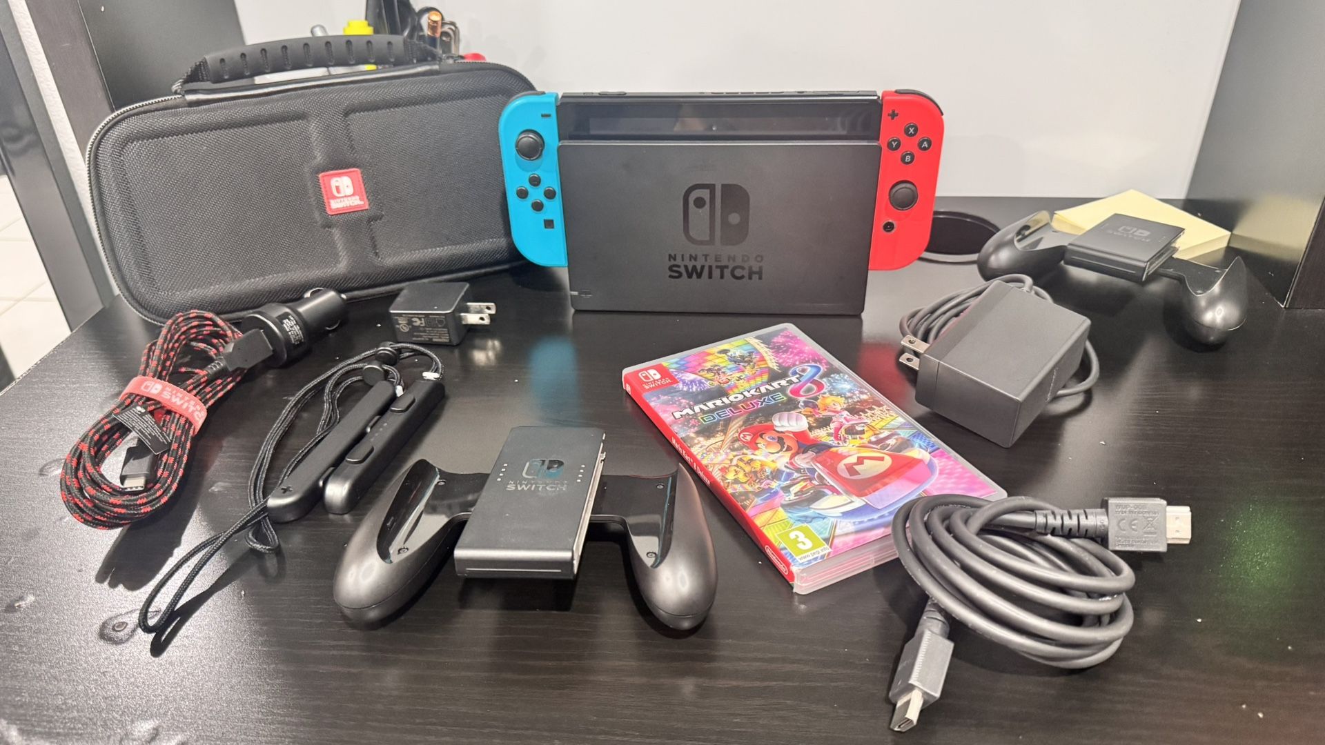Comes with: -Nintendo Switch Dock -Joy-Con (L) Neon Blue -Joy-Con (R) Neon Red -Joy-Con Wrist Straps -Joy-Con Grip x2 -High Speed HDMI Cable -Nintendo Switch AC Adapter -SanDisk microSDXC card 128 GB -Traveler Deluxe Travel Case -Car Charger -Mario Kart 8 Deluxe Works perfectly fine.