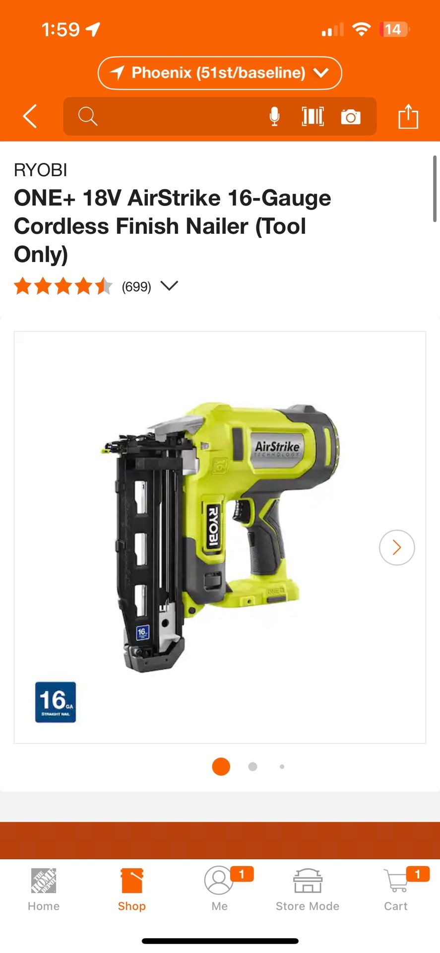 RYOBI ONE+ 18V AirStrike 16-Gauge Cordless Finish Nailer (Tool Only)