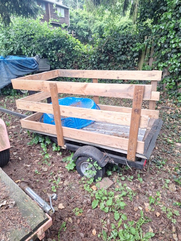 Good little trailer, tabed, and could be built to make larger, the wood itself on there now is approximately 4x8. Could be used for boat or utility trailer or make what you want. 600 obo