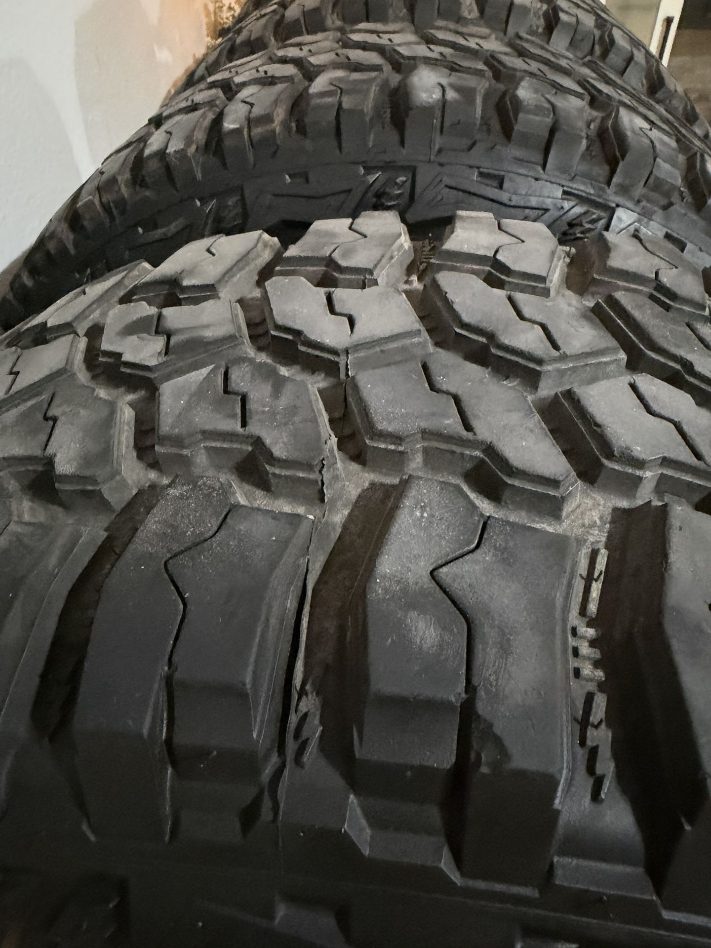 The tires are in great shape around 85% tread the size is 35x12.50r22 they are not cracked from the sun selling because I went a different route asking 800 for all 4 all of the 4 tires have the same tread