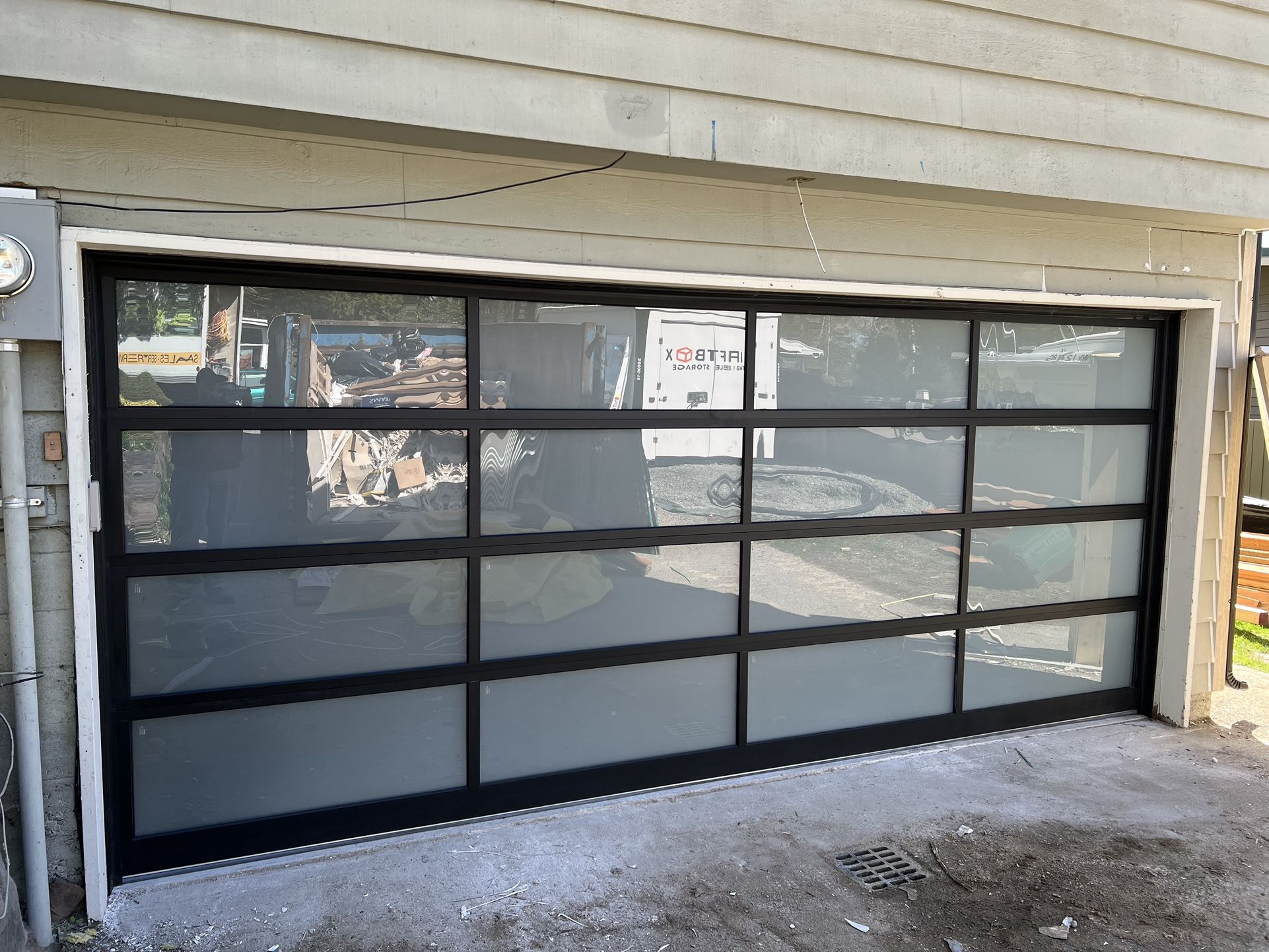 1ea 15’10x6’6” Modern Classic Black satin frame with Satin Etch Glass 1/8 with std Track or low headroom track 3.5 front inside lift Brand new door new used in the box From North west Door