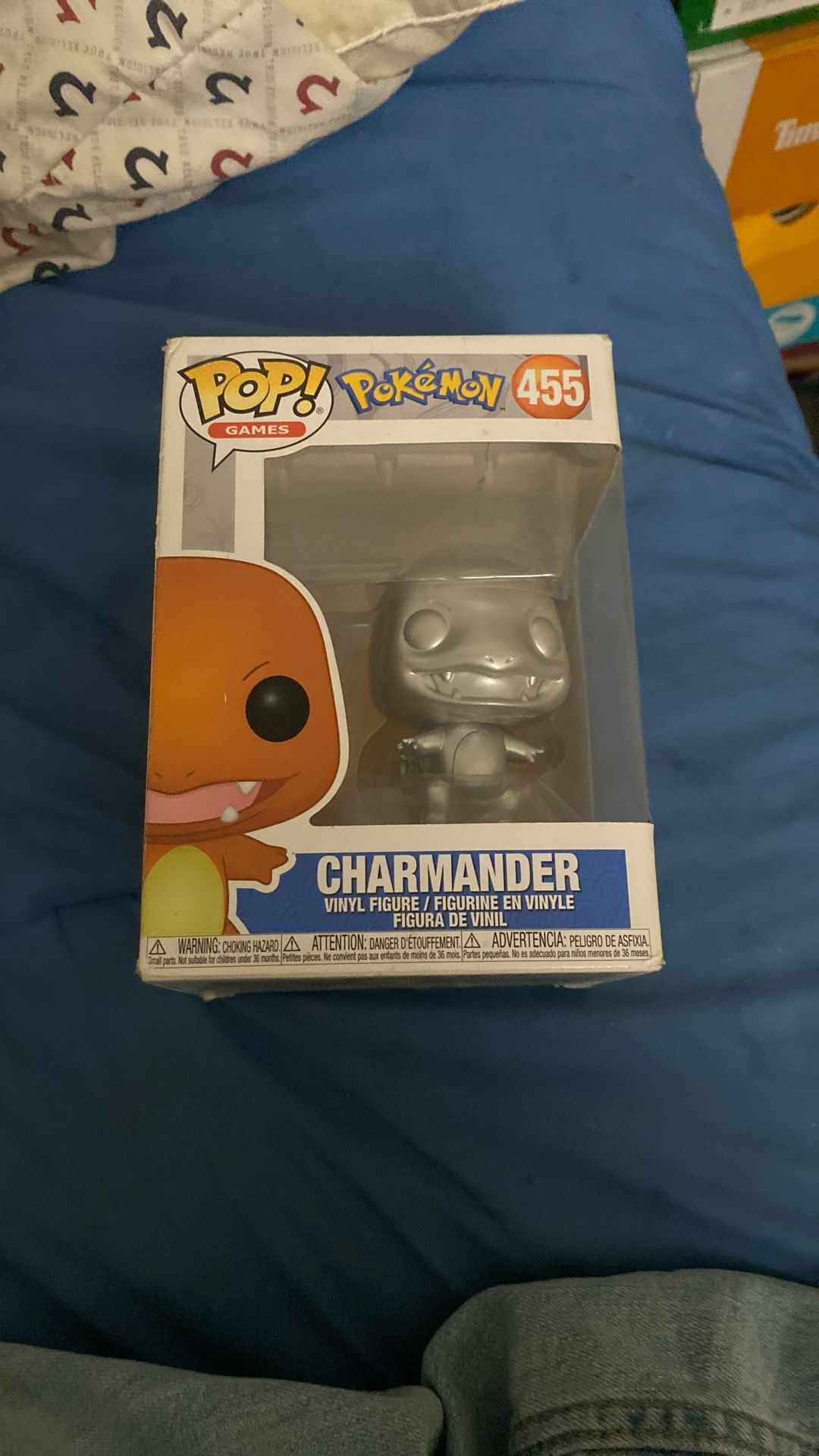 Charmander Pokémon Funko Pop (Silver). Good condition corners are just a little messed up bottoms is just a tiny bit dirty but other then those things it’s in great condition never been opened or touched before will negotiate with you.