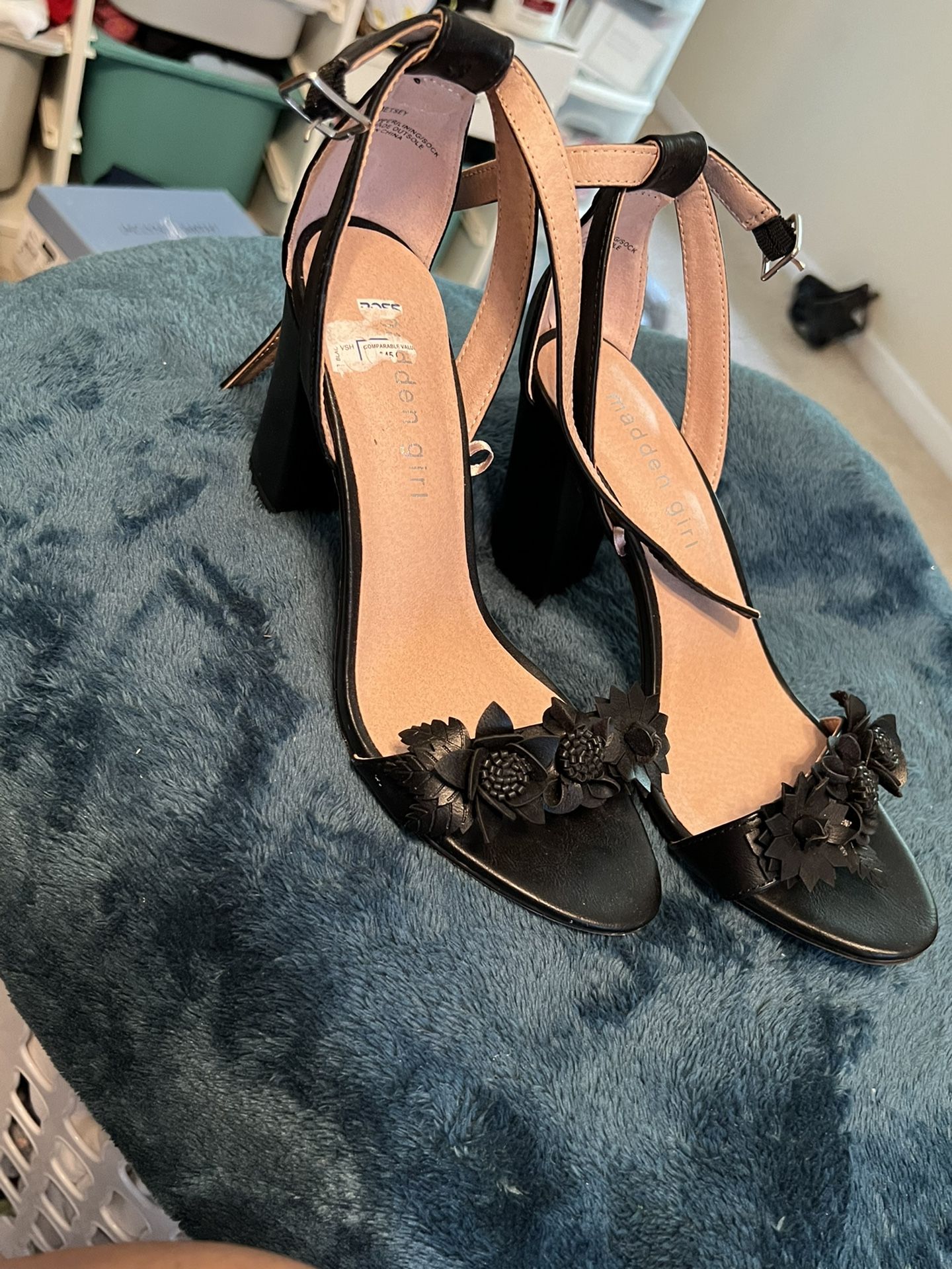 Black leather sandal with flower across the toe block heel size 8 1/2