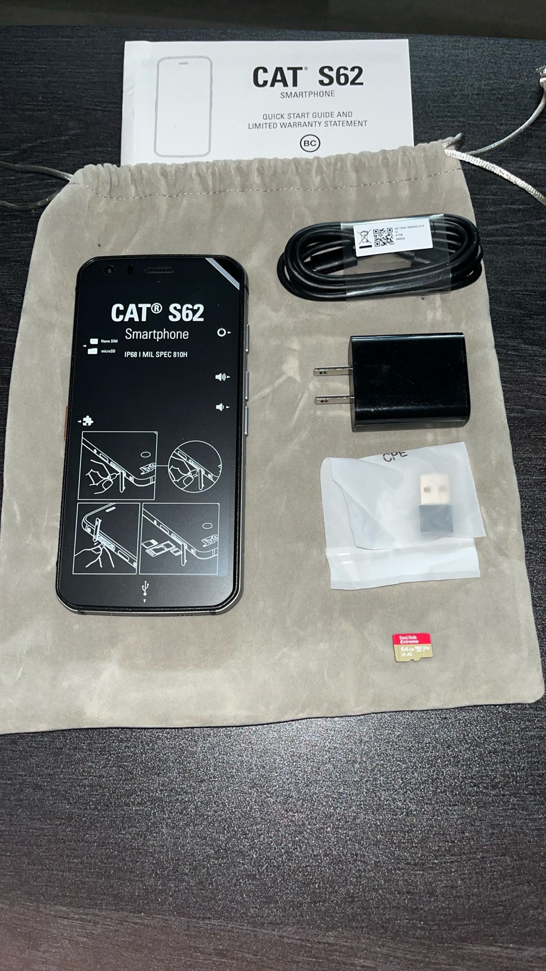 Brand New & Unlocked Cat S62 Work Phone - 128GB Storage/4GB RAM - Waterproof, Dust & Drop Proof, Durable - 4000mAh large battery, 11hrs talk time - 48MP/2MP Rear + 8MP Front Camera - All original items included: 64GN MicroSD Card with USBxSD card drive, wall adapter and cable included plus carry bag - Quick start guide & warranty info included - Fully sealed with screens & camera covered by plastic - unused, all original packaging. - Plastic bagged and cloth bag included - Can purchase on Amazon (see pic) for $181. - Open to negotiation