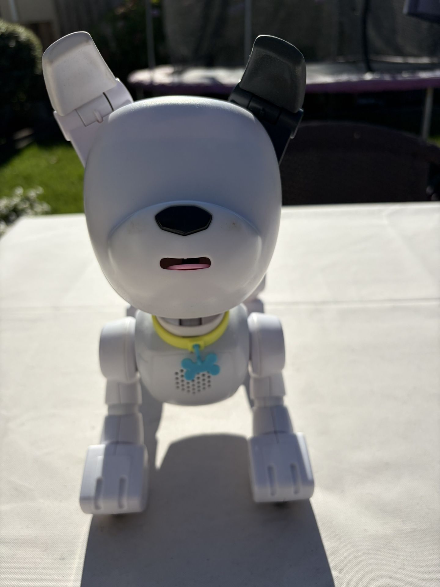 Robot dog toy. Interactive toy that works with an application. Comes with dog bone accessory.