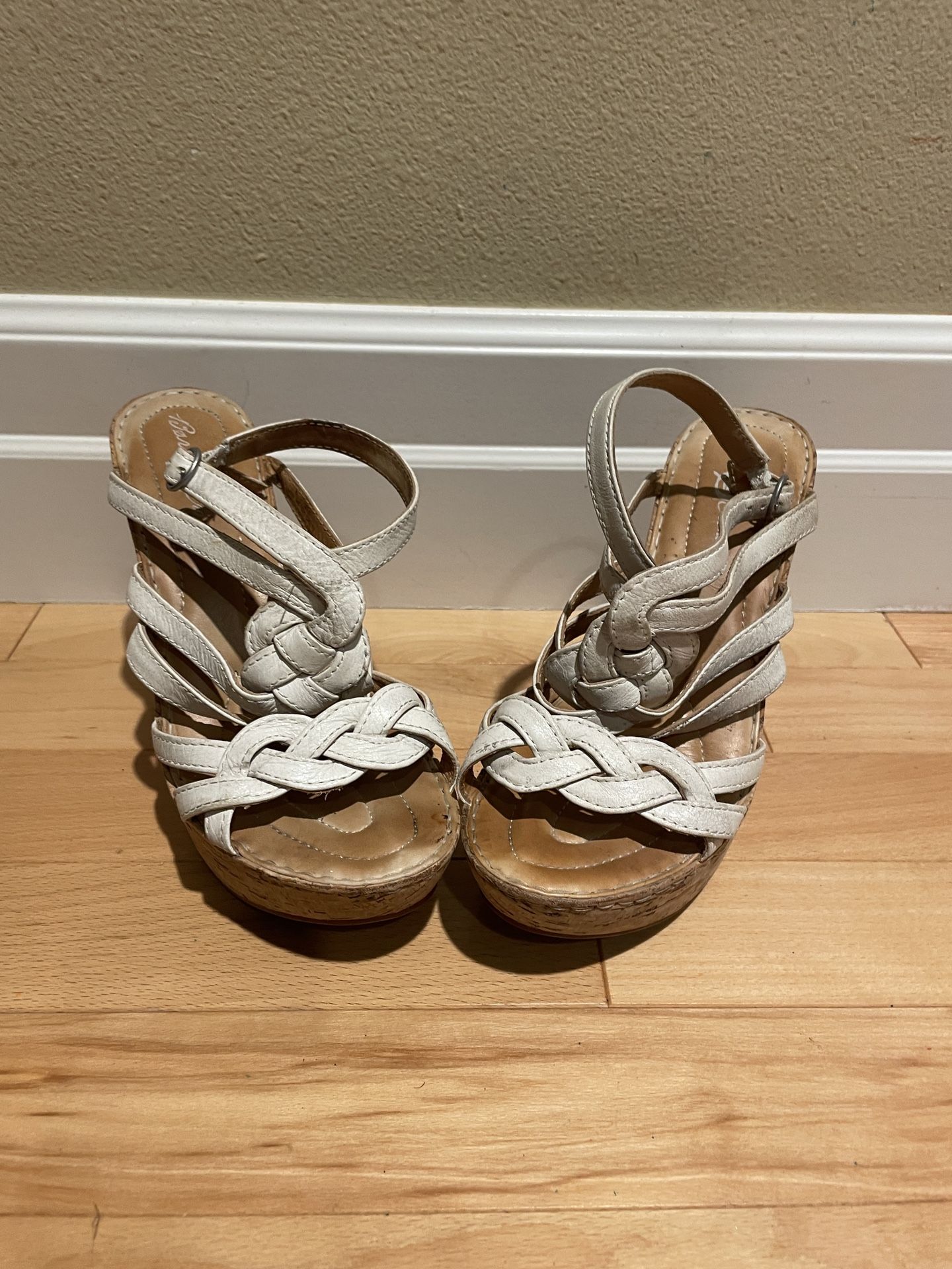 Women’s Born Crown leather wedge sandals in a neutral cream color. Genuine leather braided straps, cushioned leather footbed, and real cork wedge with rubber sole. Comfortable, stable, and easy to wear—classic Born quality. Details: Size 6 / EU 36.5 Medium/Wide width Leather upper Cork wedge Buckle ankle strap Good used condition with normal wear. No rips, cracks, or structural issues.