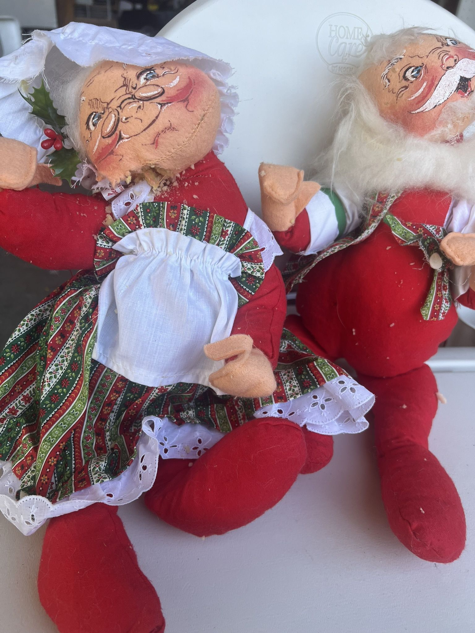 The product in the image is a vintage set of Annalee Mr. and Mrs. Santa Claus dolls. Annalee Dolls are a collectible brand known for their whimsical, smiling faces. The dolls are often poseable, with bendable arms and legs. Similar vintage Annalee Santa and Mrs. Claus. See pictures. The dolls come in various sizes, with some sets being around 17 to 18 inches tall. Local pickup in Denver area. Cash only. Rare.