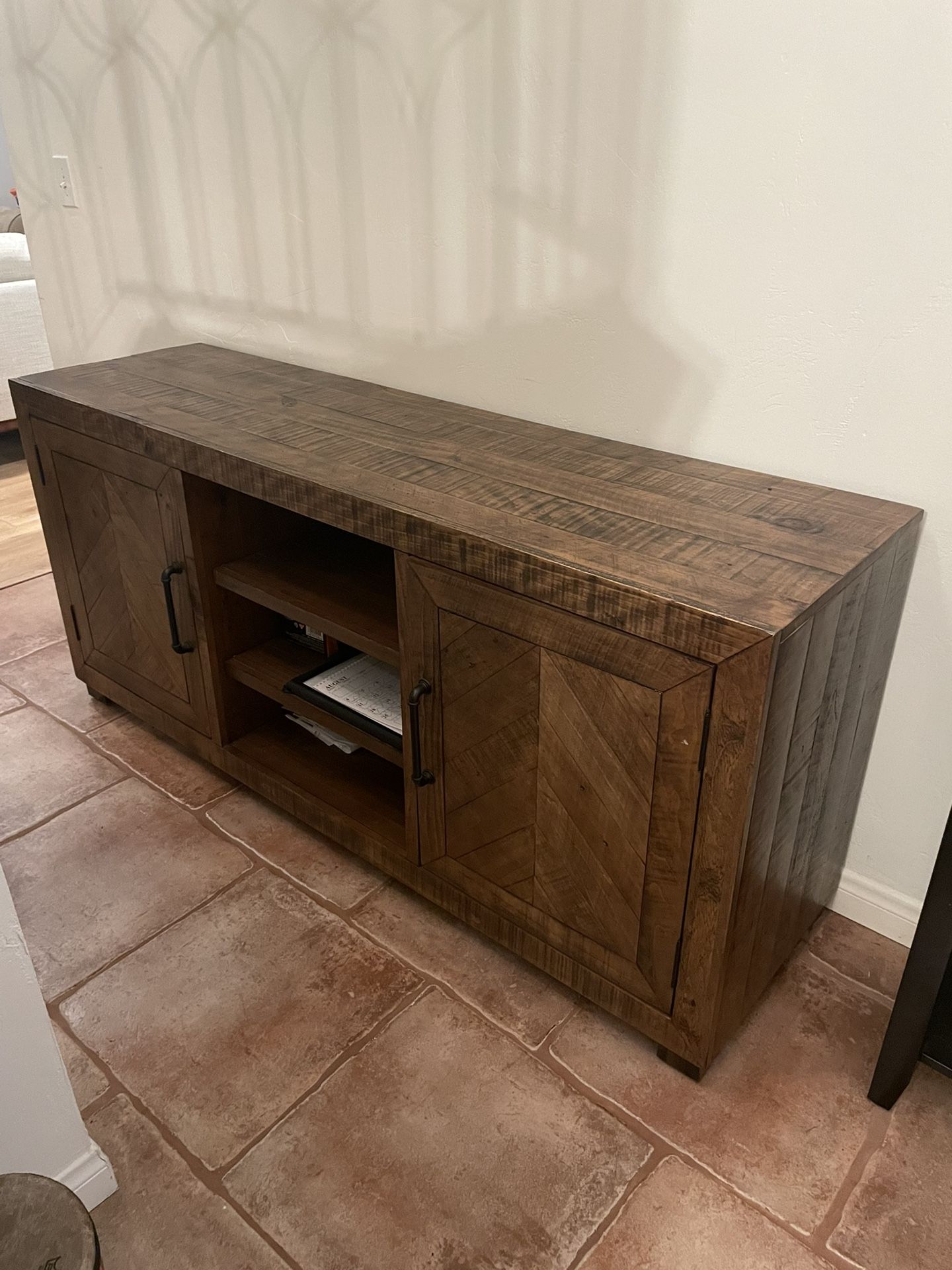 Very sturdy and good as new tv stand and entertainment center. 65Wx18Dx29.5H. This is a fine piece of furniture that I hate to get rid of but we’re removing our TV from that room. Only a couple years old. Great storage space inside. Worth every penny.